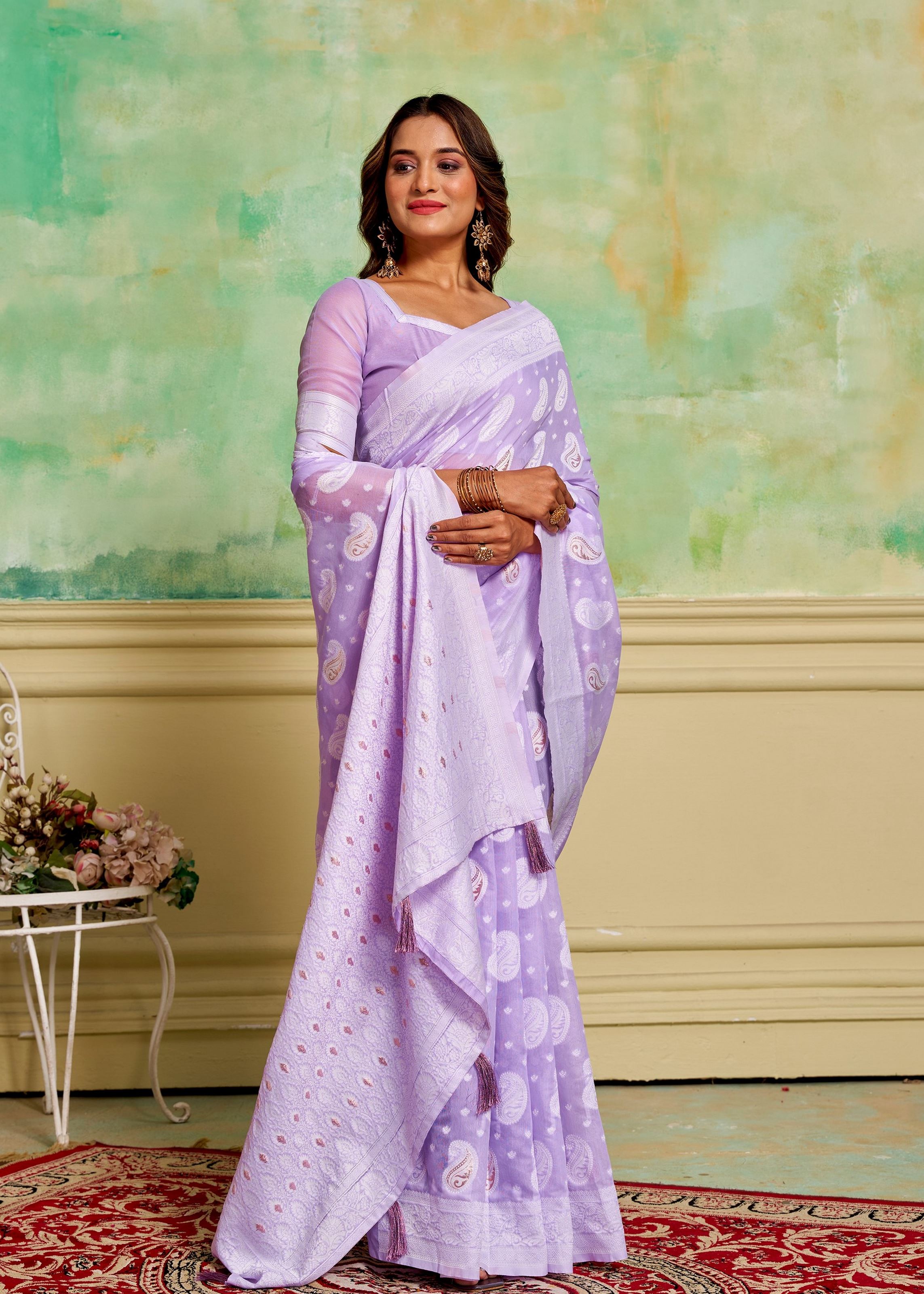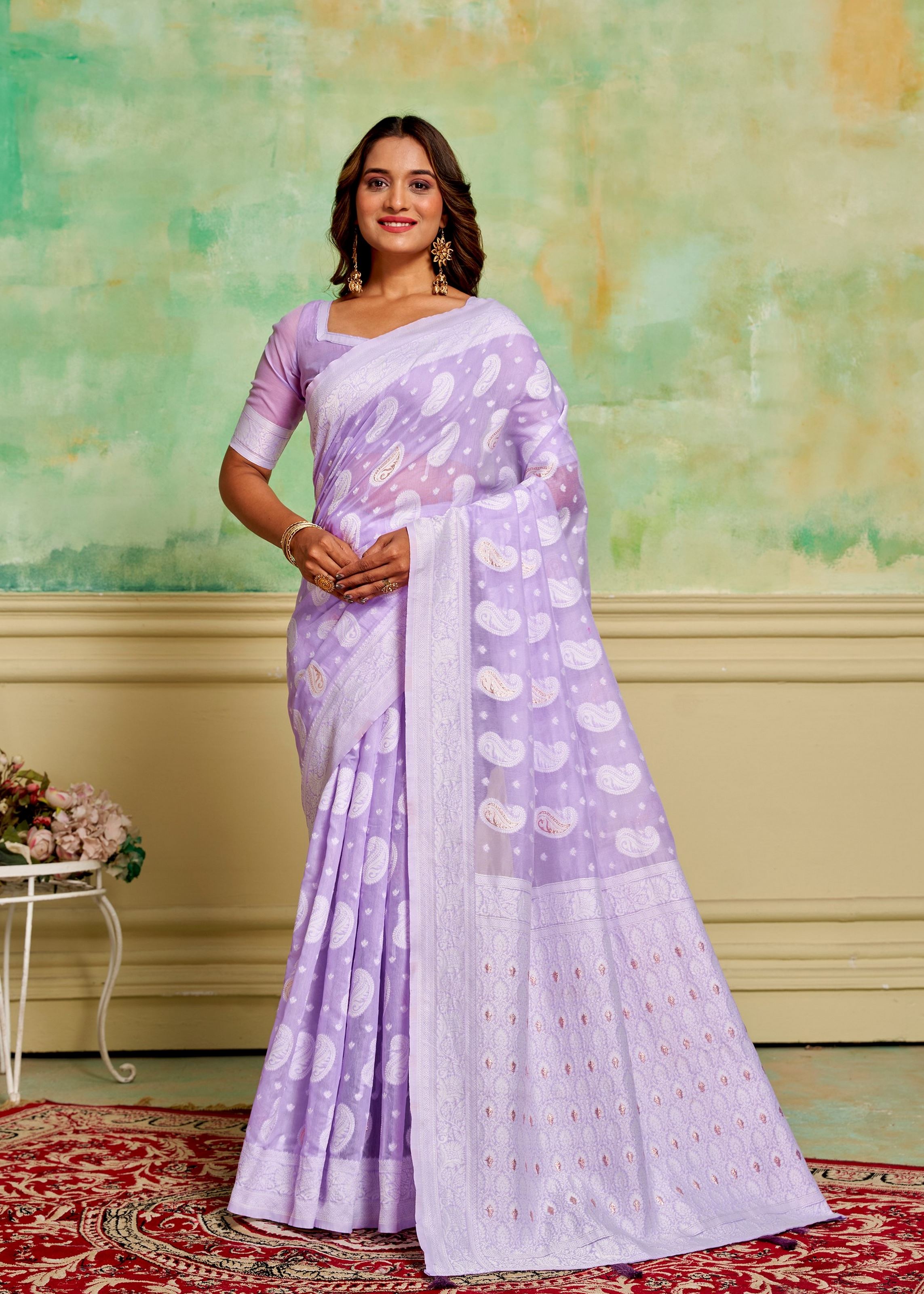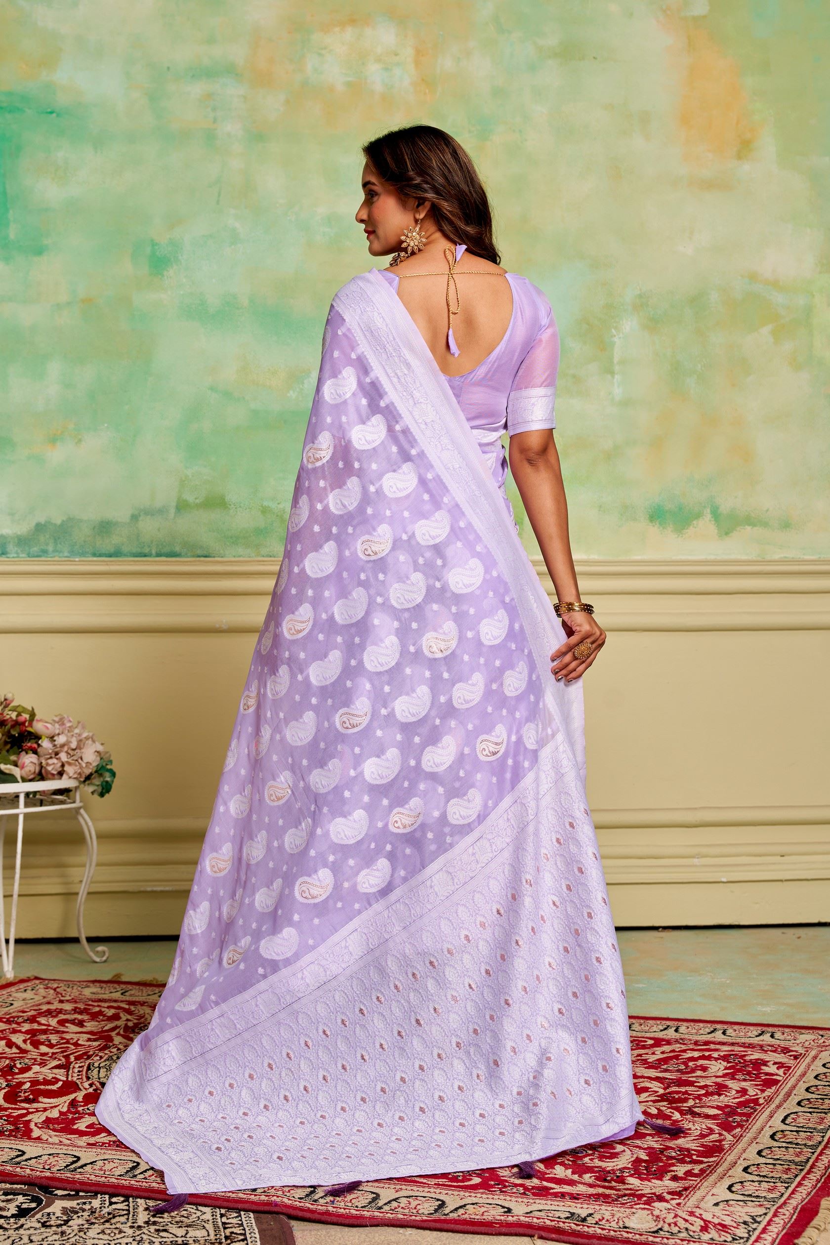 Paired with a matching lavender cotton blouse, the saree ensures a polished and coordinated look. Its lightweight fabric allows effortless draping and long-lasting comfort, while highlighting the intricate woven details. Pair it with minimalist jewelry or subtle ethnic accessories to achieve a look that combines tradition with modern aesthetics. Designed for women who value authentic craftsmanship, this saree offers both elegance and practical wearability.