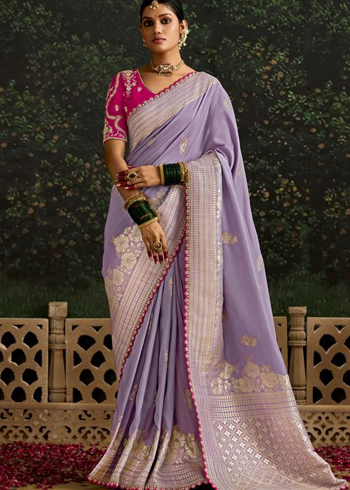 Lavender Dola Silk Saree With Jacquard Woven with Embroidered Lace Border