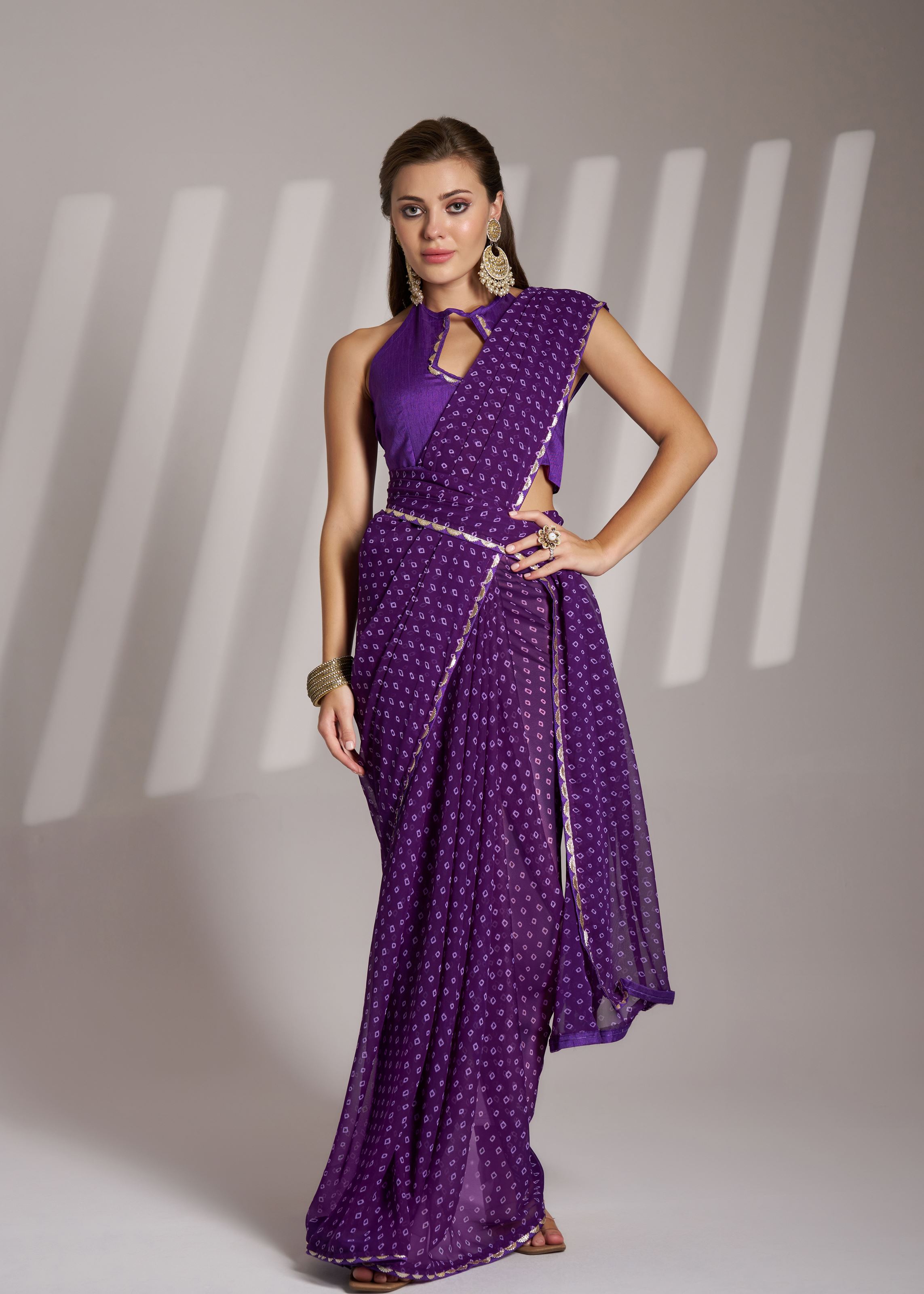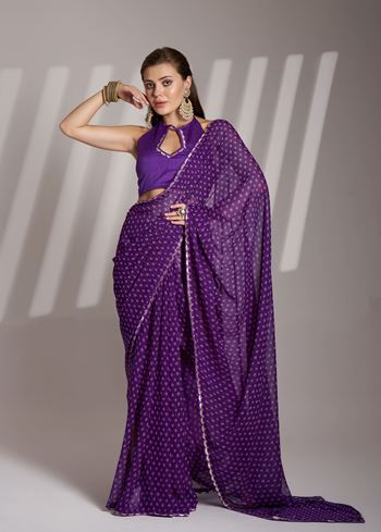This saree is complemented by a matching lavender art silk blouse, which provides a perfect contrast of textures—smooth silk paired with flowing georgette. The combination enhances the overall richness of the outfit, making it suitable for glamorous evenings and elegant get-togethers.Pair it with silver or diamond jewelry, high heels, and a chic clutch to complete your look. With its blend of comfort, modern charm, and timeless appeal, this lavender georgette saree is sure to turn heads wherever you go.Make this partywear Bollywood saree your go-to choice for creating unforgettable style moments.