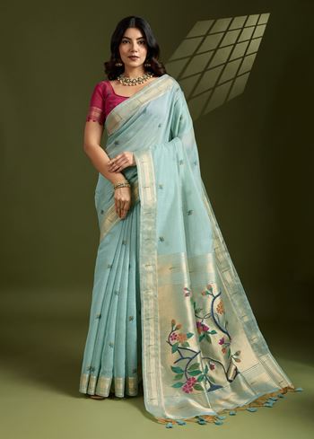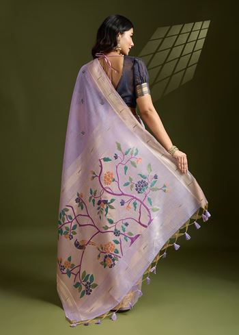 The soothing lavender tone brings modern charm to a classic silhouette, making it a versatile pick for weddings, festive functions, or cultural events. The intricately woven Paithani pallu introduces a pop of heritage with its vibrant, traditional motifs—adding visual richness and storytelling depth. Paired with a navy-blue blouse in matching Muga cotton, this saree achieves the perfect balance of soft elegance and striking contrast.