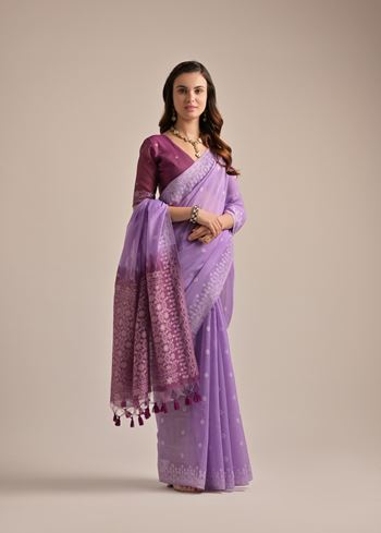 The soothing lavender hue brings a fresh, contemporary appeal, beautifully contrasted by delicate thread butti work that adds subtle texture and intricacy across the body. The crowning glory is its Lakhnawi-style pallu, inspired by classic chikankari artistry—featuring ornate thread patterns that lend the saree a timeless, handcrafted feel.