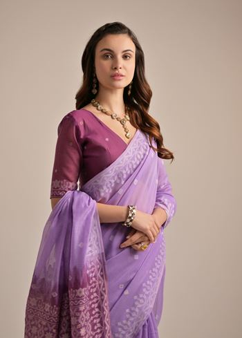 Radiating a graceful charm, the Lavender Muga Cotton Saree with Thread Butti and Lakhnawi Pallu is a perfect blend of modern pastel aesthetics and traditional craftsmanship. Made from soft, breathable Muga cotton, the saree ensures all-day comfort while exuding a refined elegance.