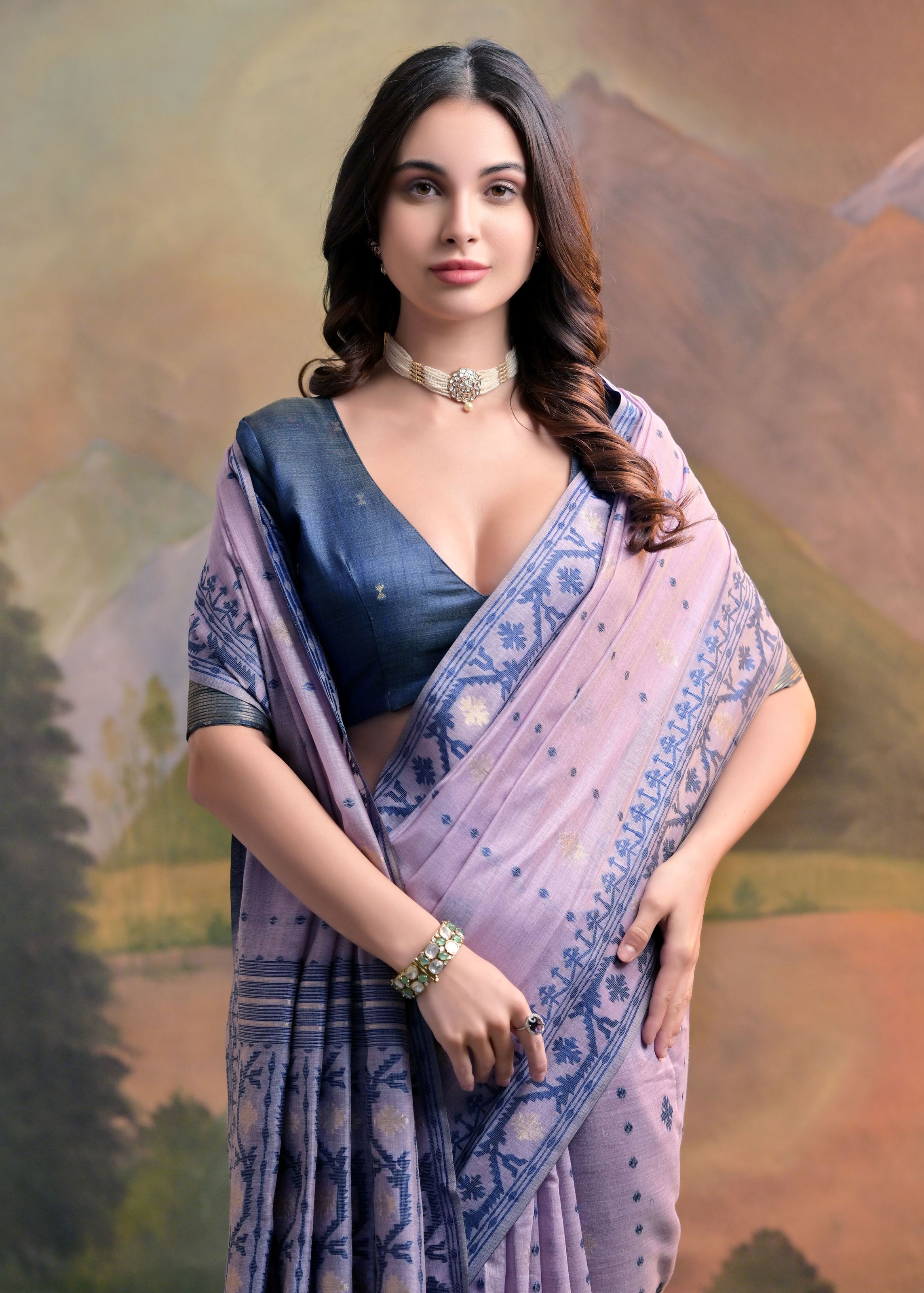 The gentle lavender hue brings a fresh and sophisticated touch to traditional styling, while the fine thread buttis create a graceful textural rhythm across the fabric. Paired with a contrasting blue blouse made from the same Muga cotton, the look is contemporary yet rooted in timeless Indian design.