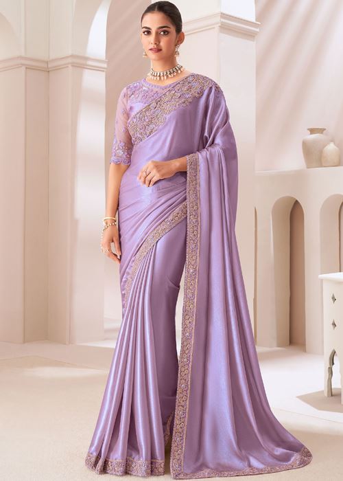 Lavender Satin Chiffon Saree With Heavy Thread Embroidery Sequins Work Lace Border Saree With Embroidery Blouse
