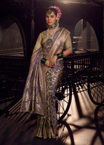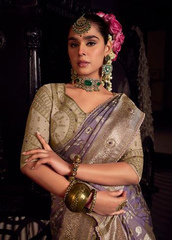 Paired with a contrasting beige pure viscose tissue blouse, the ensemble strikes a harmonious balance between subtlety and sophistication. The blouse features exquisite embroidery, adding rich detail that complements the saree’s gentle sheen. Together, they create a look that is both graceful and captivating, ideal for day or evening occasions.