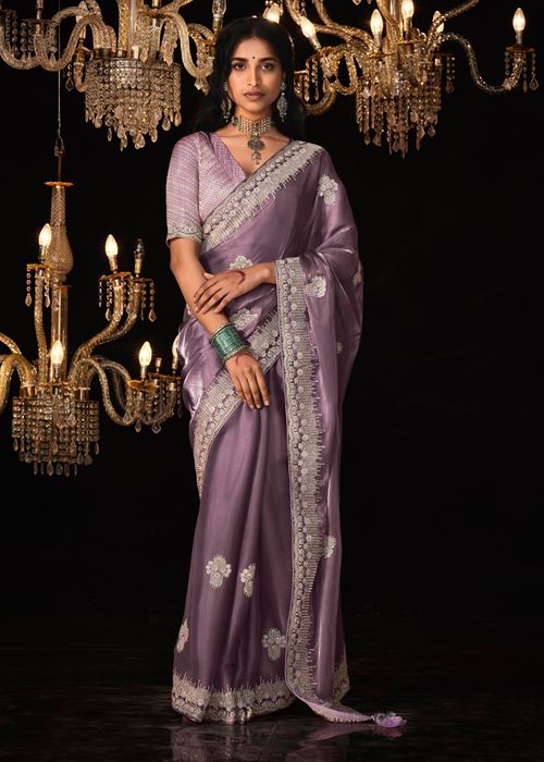 Lavendor Tissue Silk Saree With Heavy Thread and Zari Embroidered Work