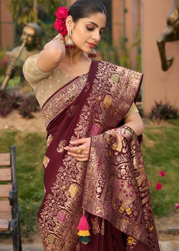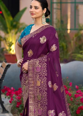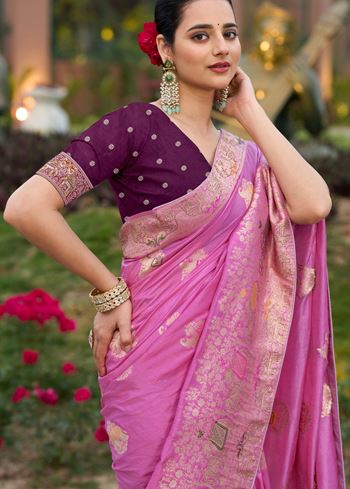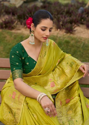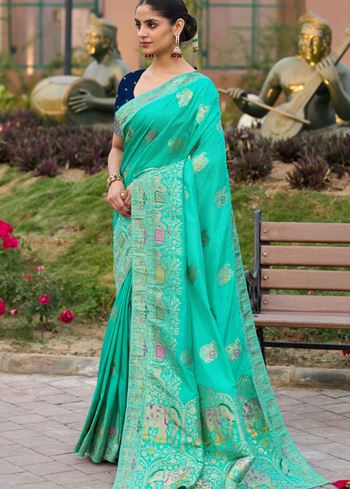 Paired with a contrasting green pure Dola silk blouse, the ensemble delivers a balanced play of soft and bold tones. The jacquard patterns lend an artisanal charm to the saree, making it a standout pick for those who value craftsmanship and timeless design. Lightweight and easy to carry, it’s both comfortable and sophisticated.