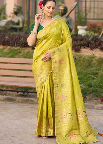 Infuse freshness and radiance into your ethnic wardrobe with Aethnofit Fashions’ Lemon Pure Dola Silk Saree—a captivating piece designed to reflect grace and vibrance. Woven from high-quality pure Dola silk, this saree drapes with a smooth, luxurious finish and offers a soft, elegant sheen perfect for festive gatherings, pre-wedding events, and religious celebrations. The cheerful lemon hue uplifts your look with its light, airy appeal, while jacquard woven work adds a touch of traditional richness.