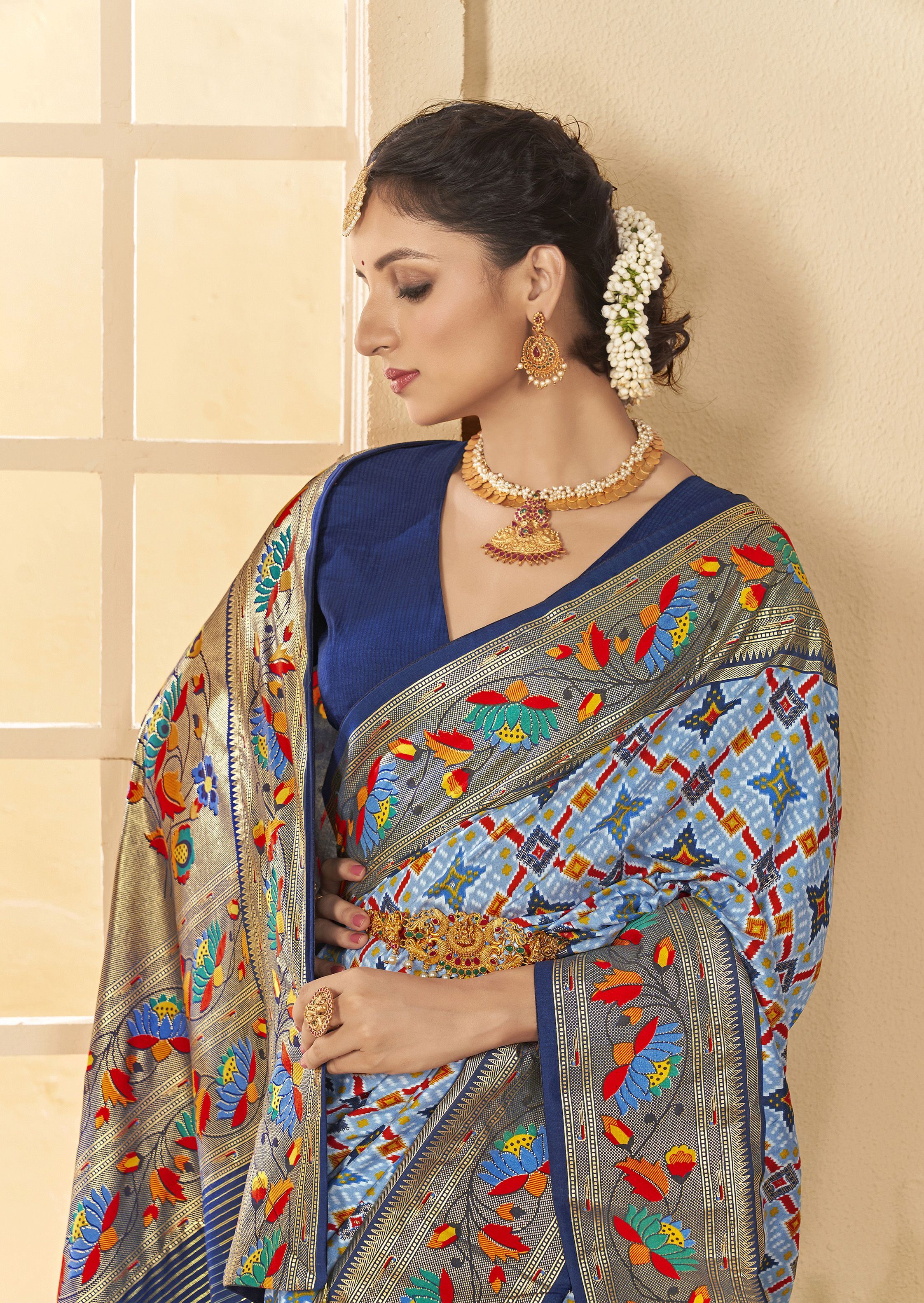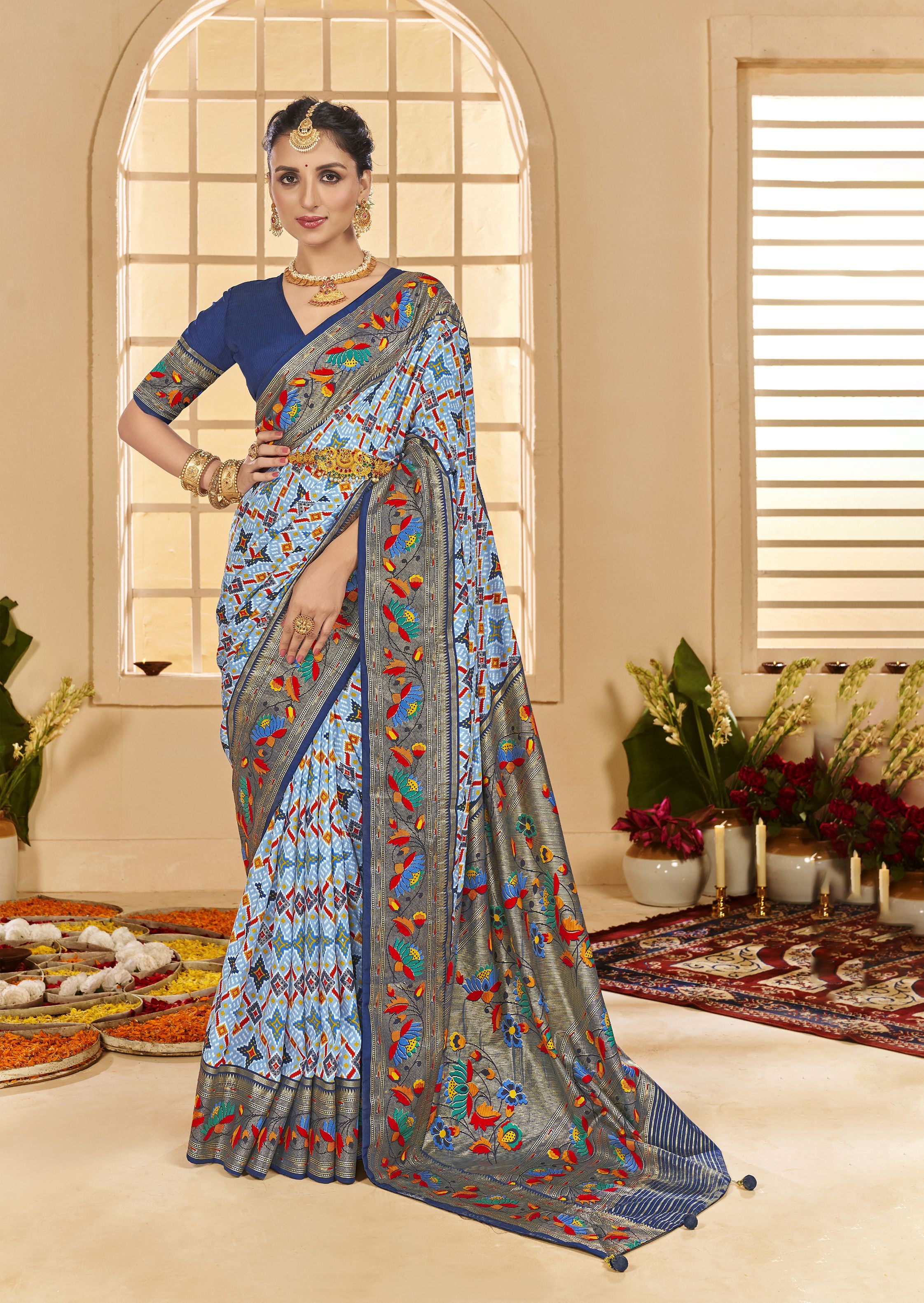 Light Blue Ethnic Woven Border Designer With Ikkat Printed Cotton Silk Saree