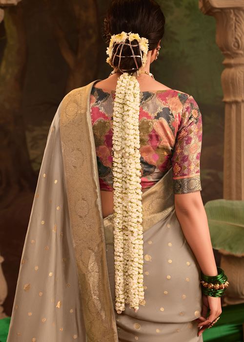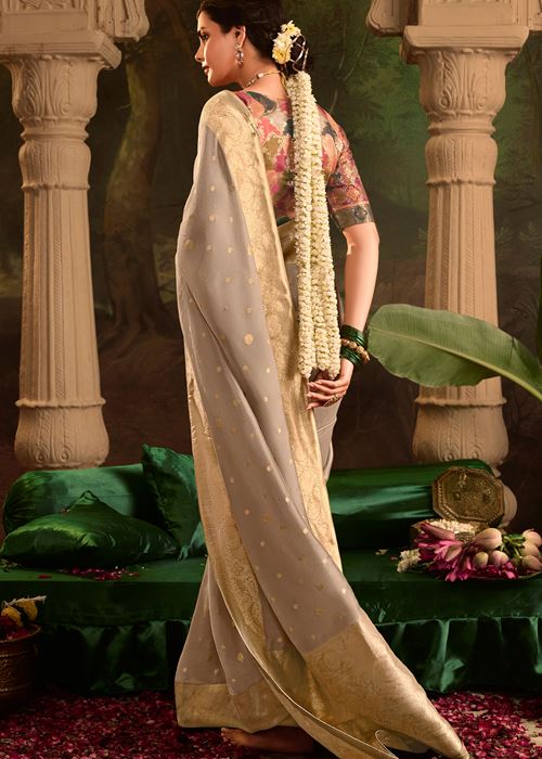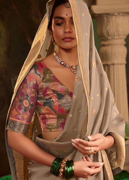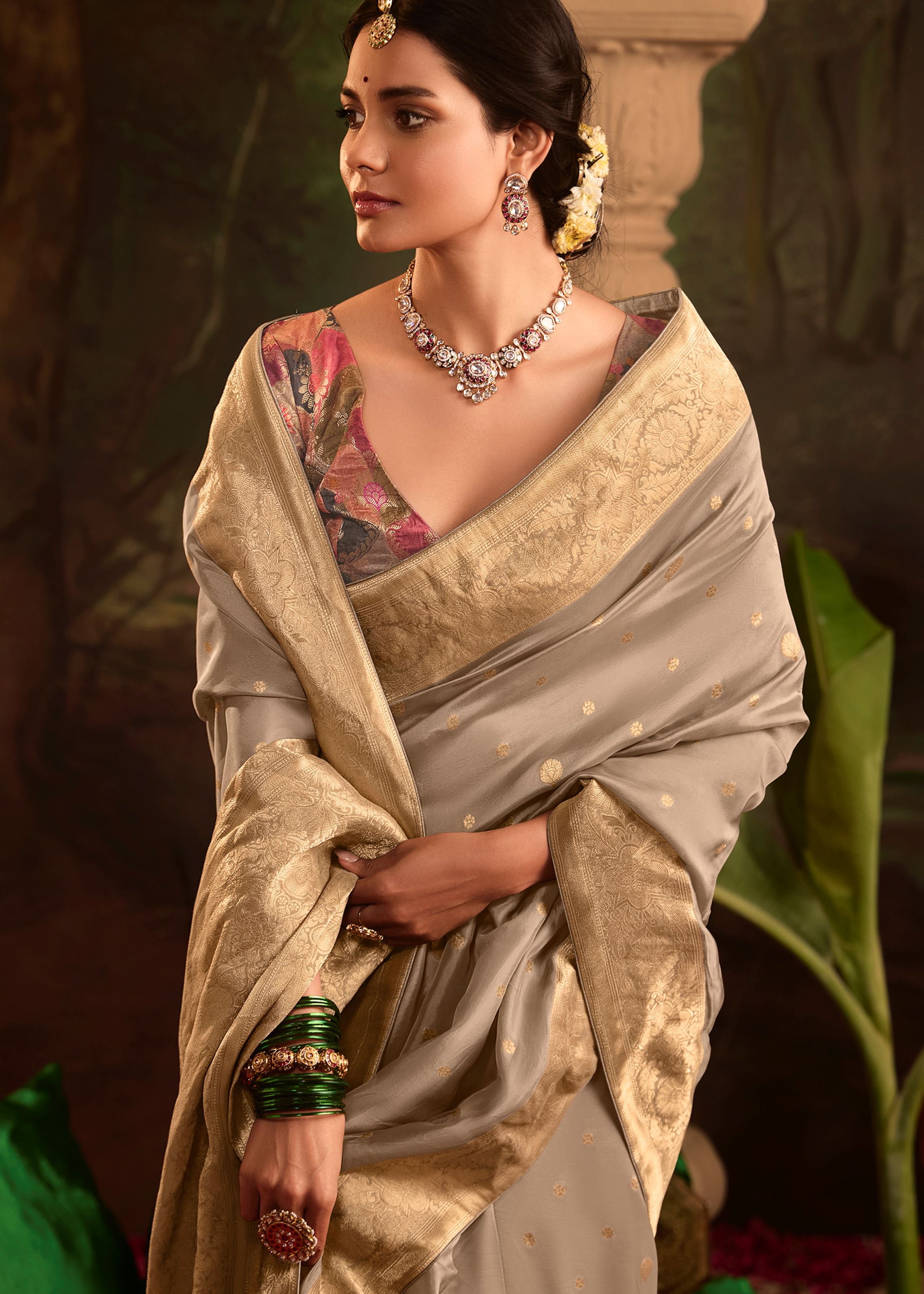 Light Brown Pure Crepe Dola Silk Saree With Jacquard Woven Work