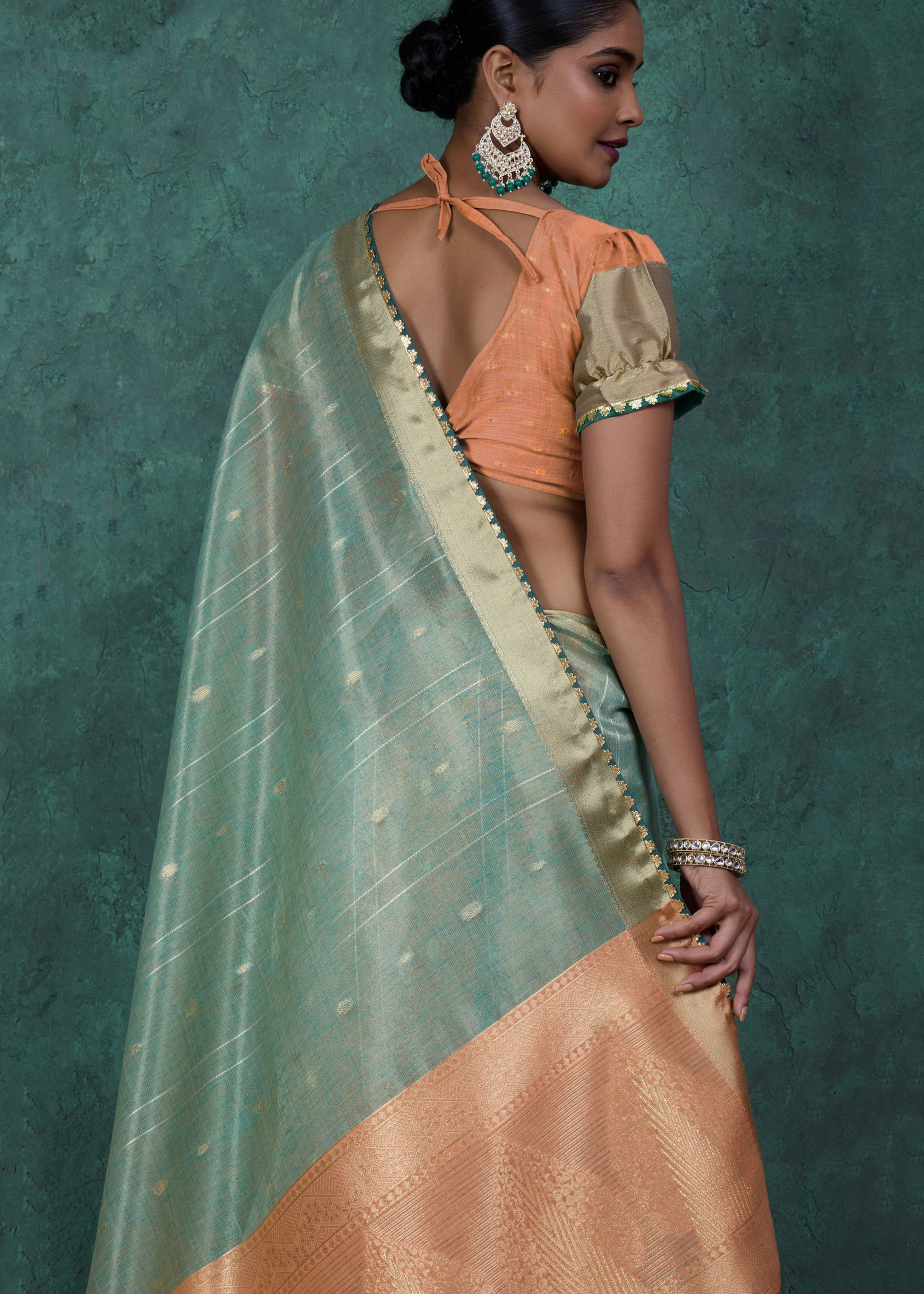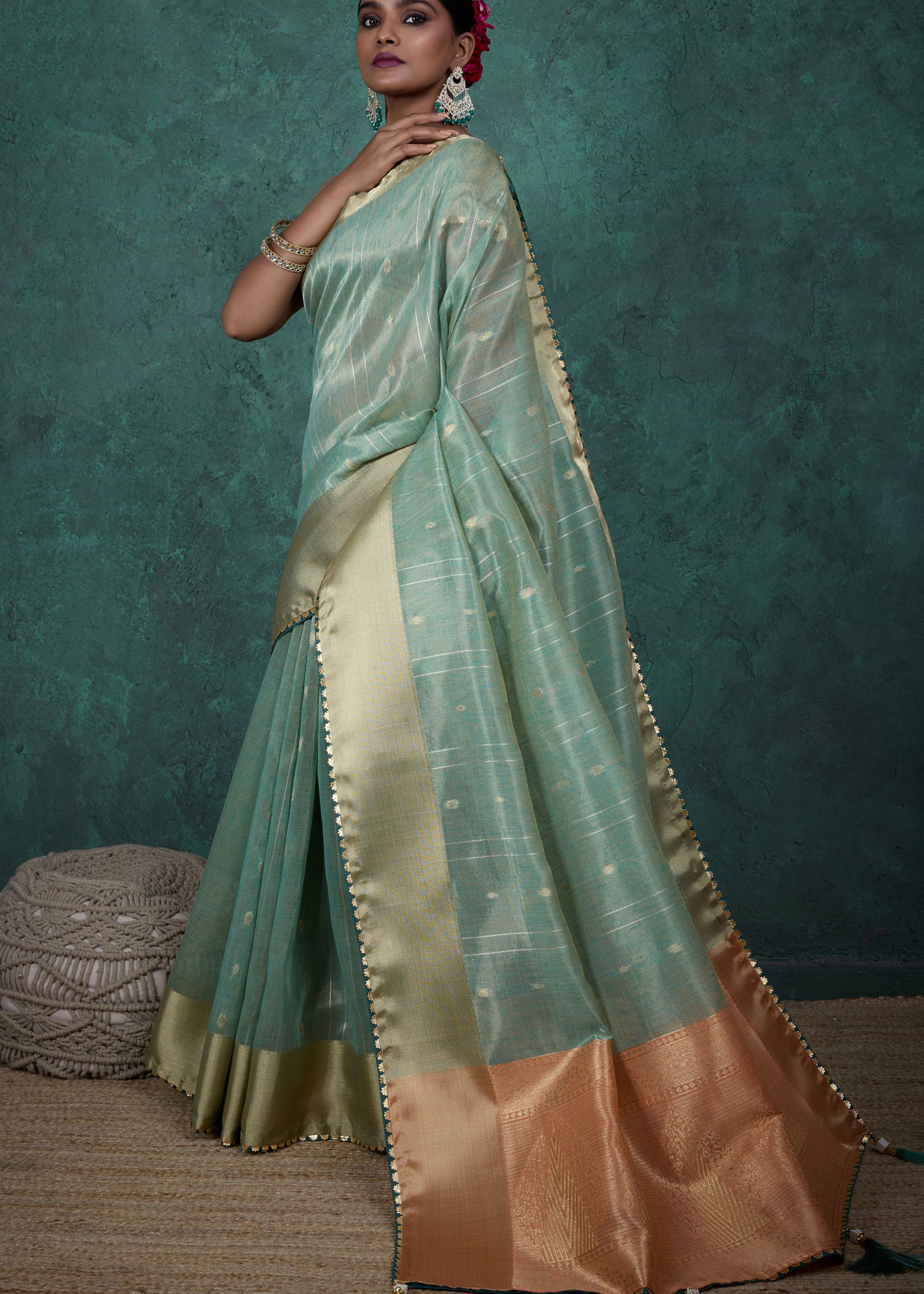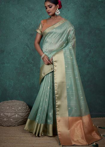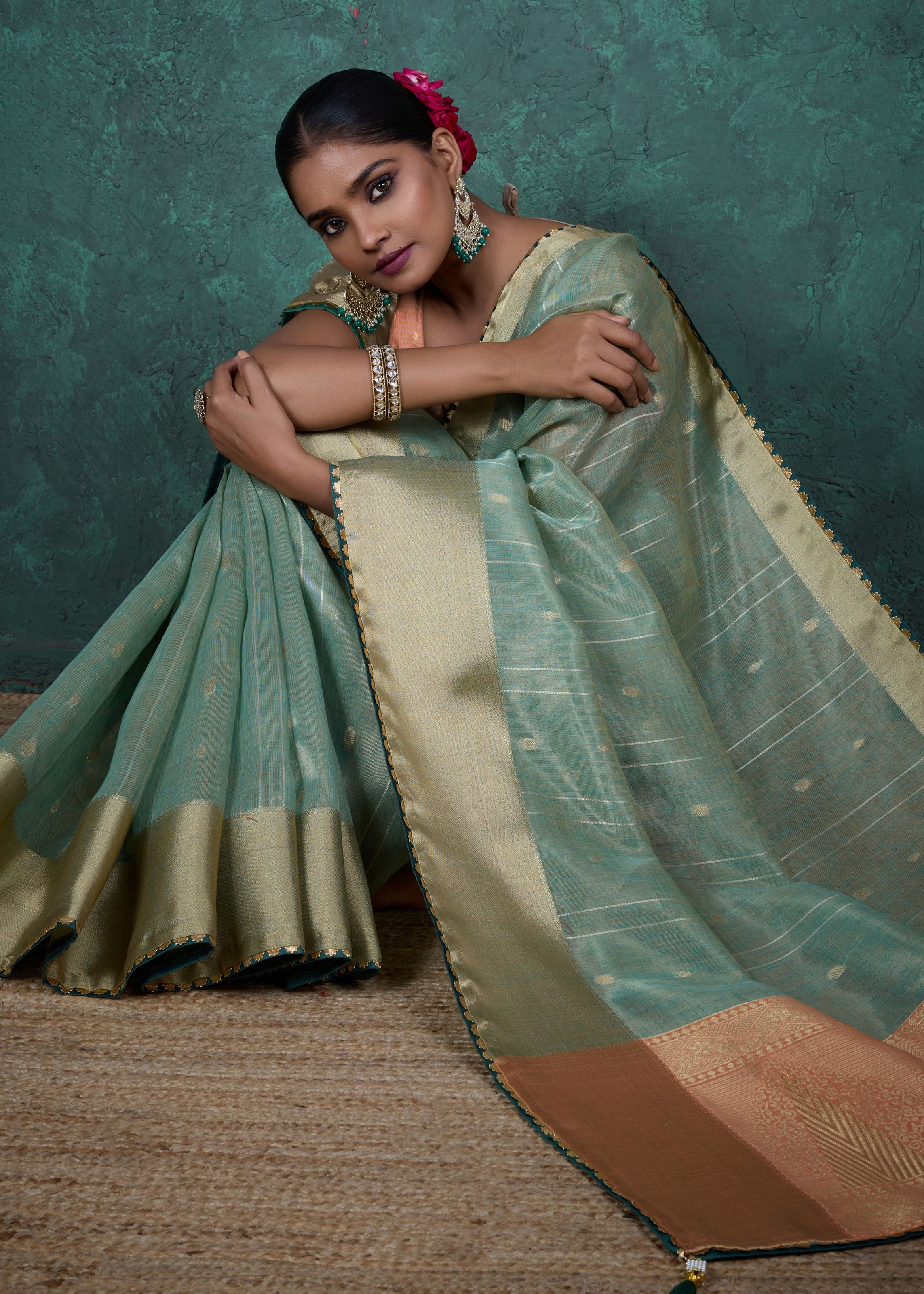 Light Green Color Linen Blend Saree with Self Woven Butta, Grand Broad Patta & Sequins Woven Pallu