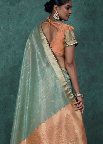 The subtle self-woven butta design across the saree adds depth and traditional texture, while the grand broad patta enriches its borders with a hint of regal flair. The sequins-woven pallu provides a graceful shimmer, giving the saree a refined festive touch without being overpowering. Paired with a contrasting peach linen blend blouse, this combination brings in a refreshing pop of color while maintaining an overall graceful silhouette.
