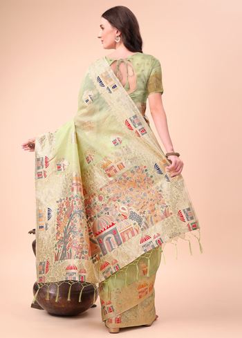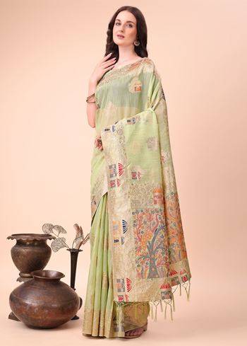 Light Green Linen Cotton Woven Jacquard Designer Ethnic Festive Wear Saree