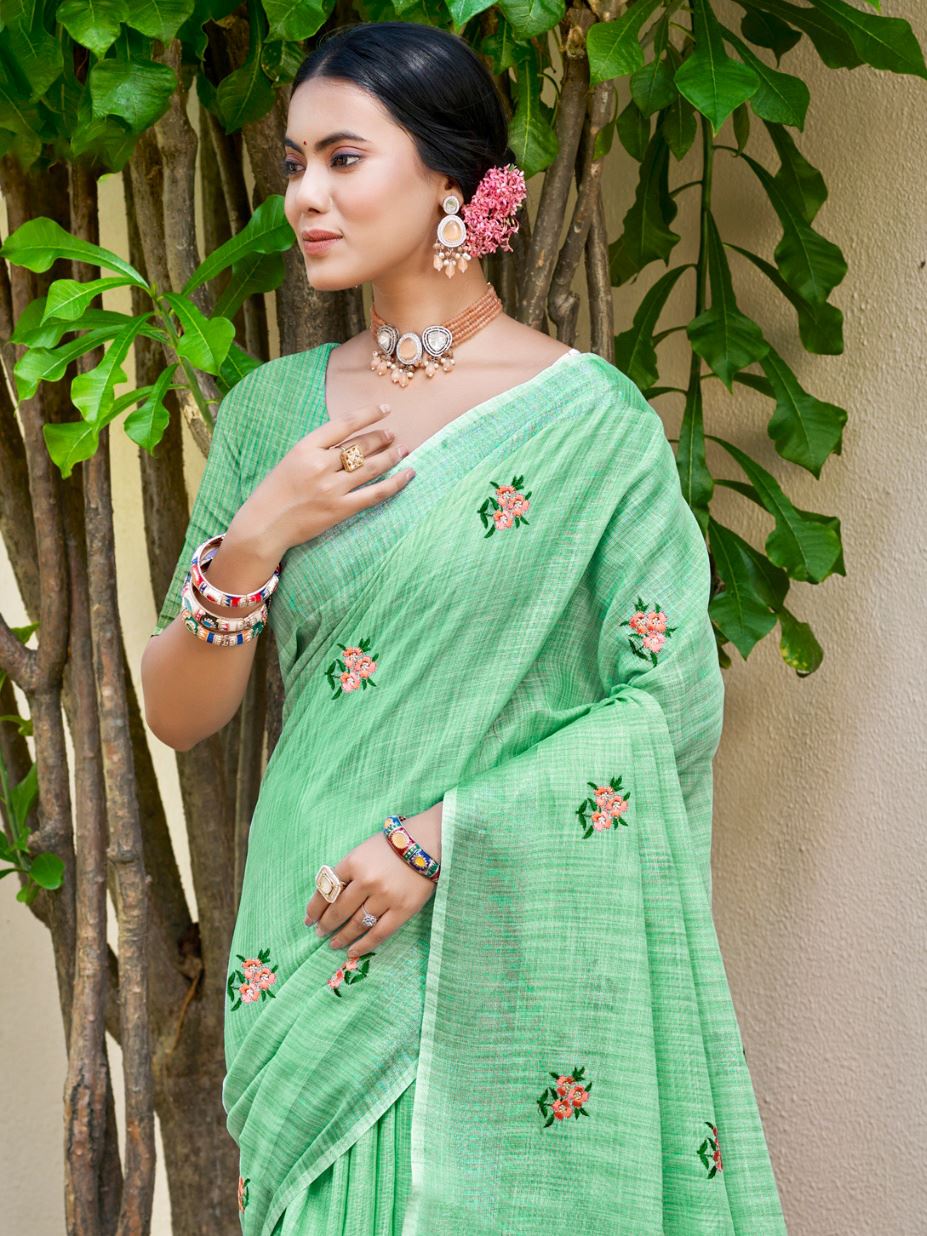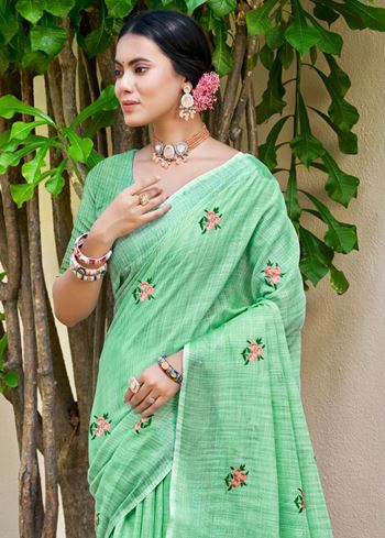 Redefine your ethnic style with the Light Green Linen Saree — where timeless drape meets contemporary charm.