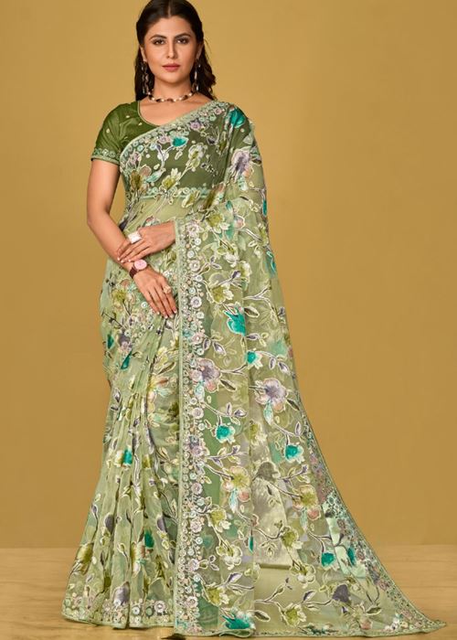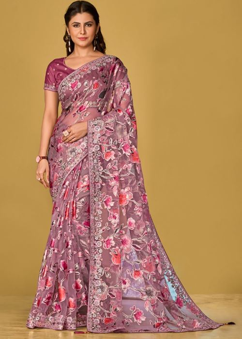 Light Mauve Soft Organza Brasso Saree With Printed Saree With Piping, Embroidery Sequins Work