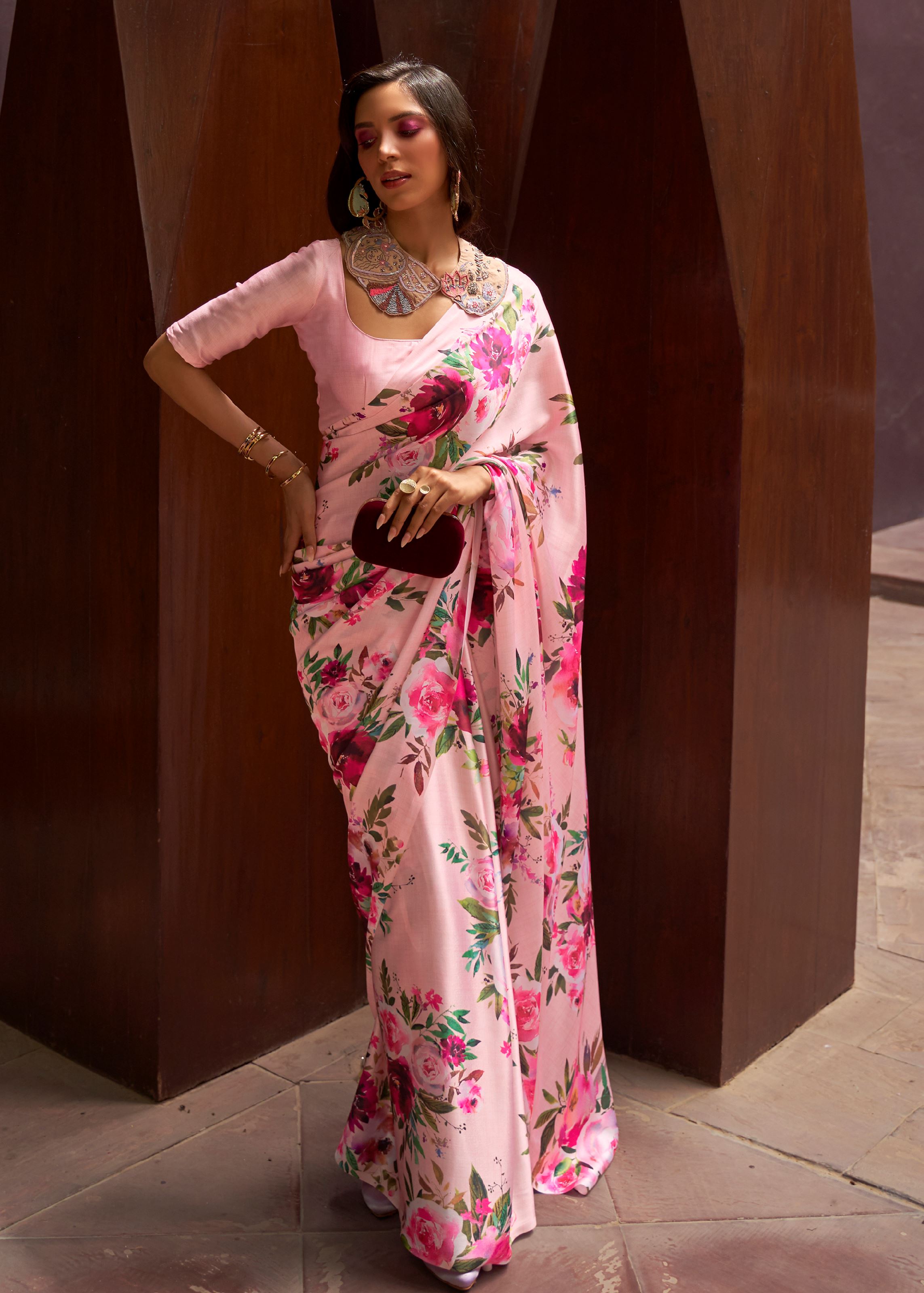 Light Pink Satin Crepe Saree With Digital Printed Work