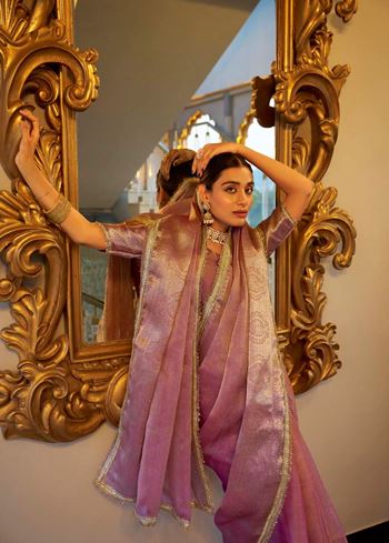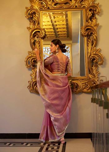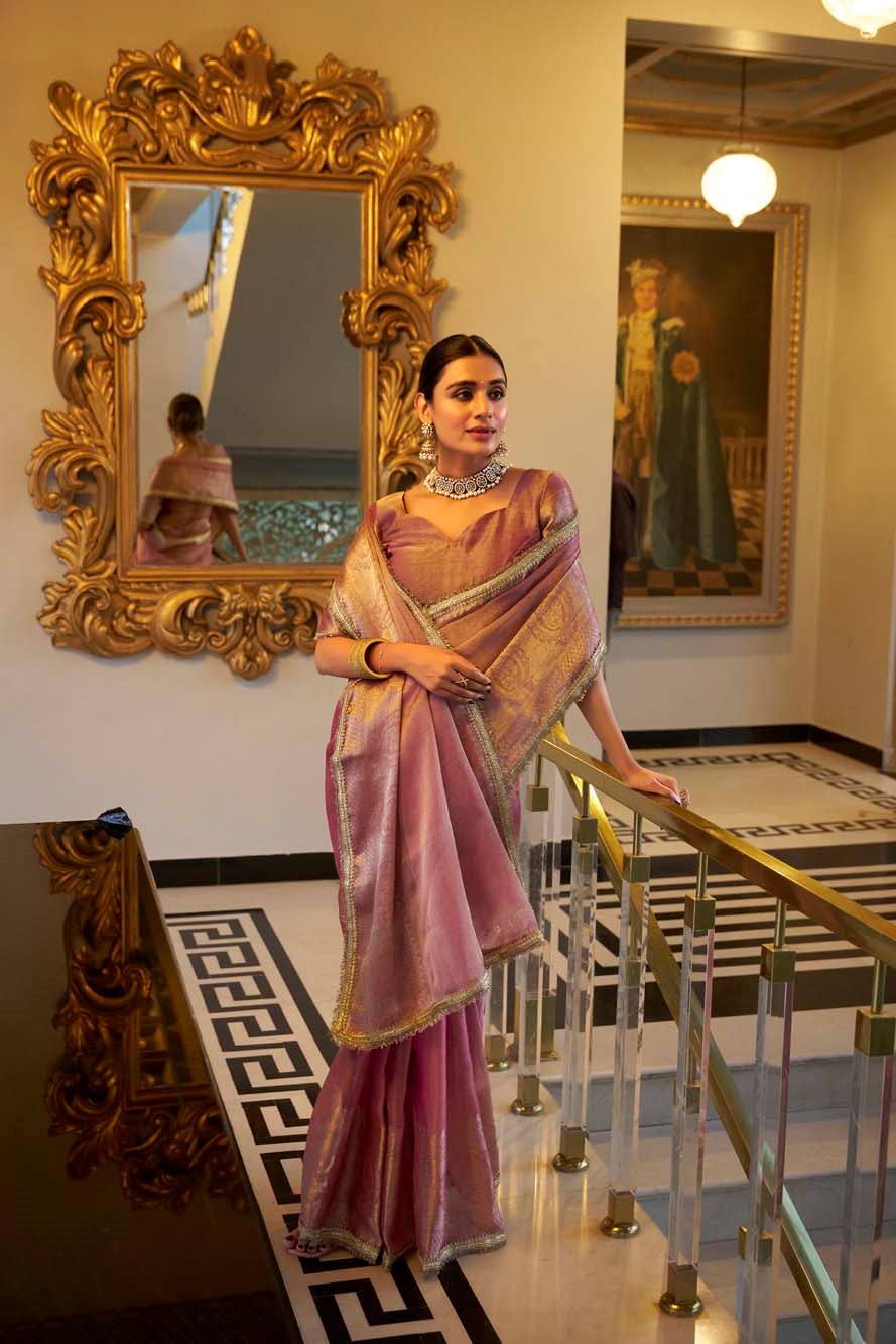Light Pink Tissue Shimmer Saree with Zari Weaving & Sequins Lace
