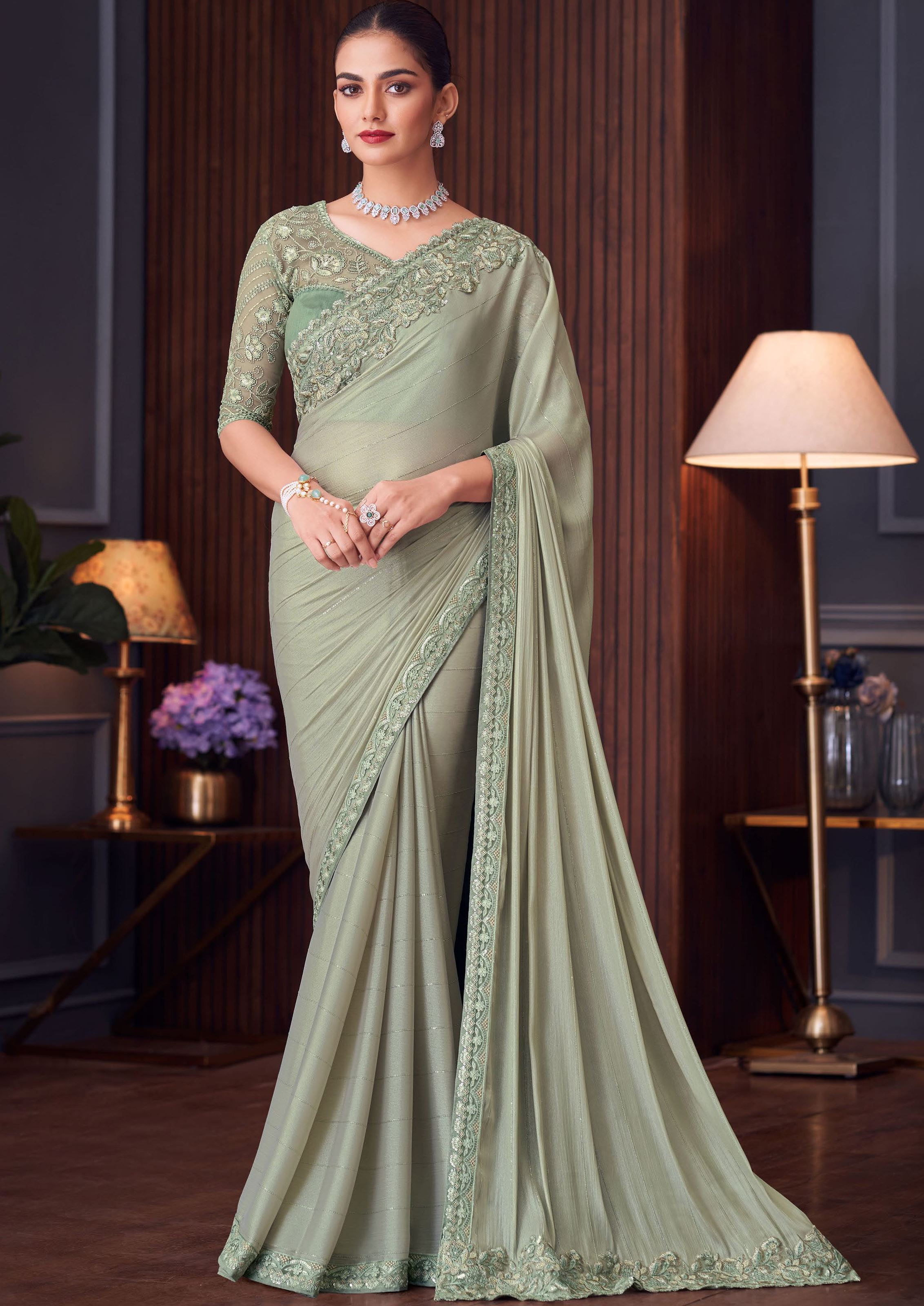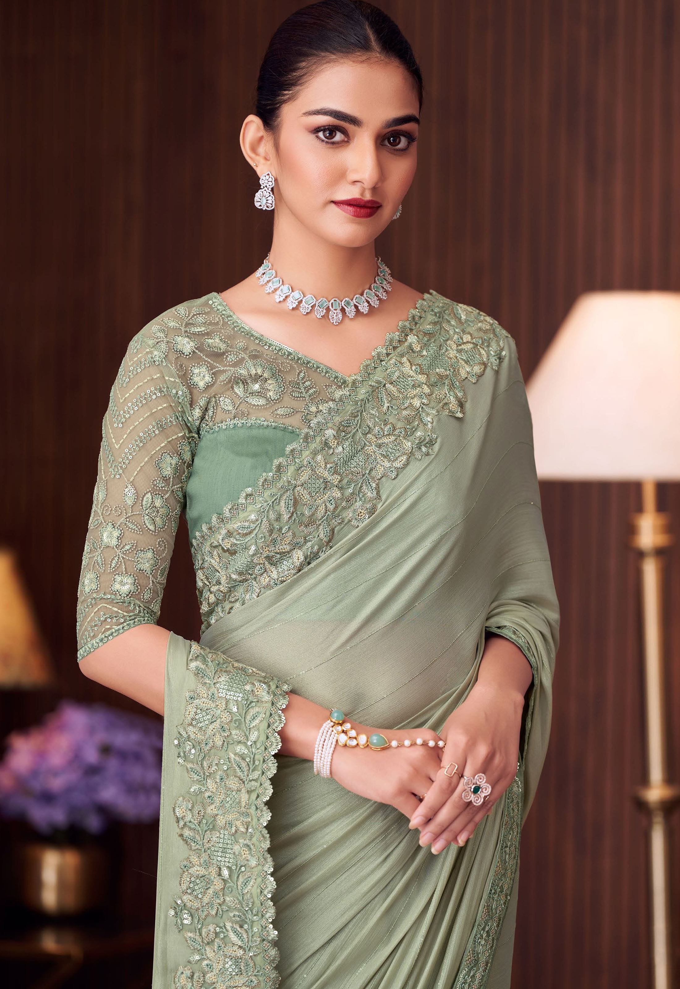 Light Pista Green Saree With Heavy Thread Embroidery Sequins Work