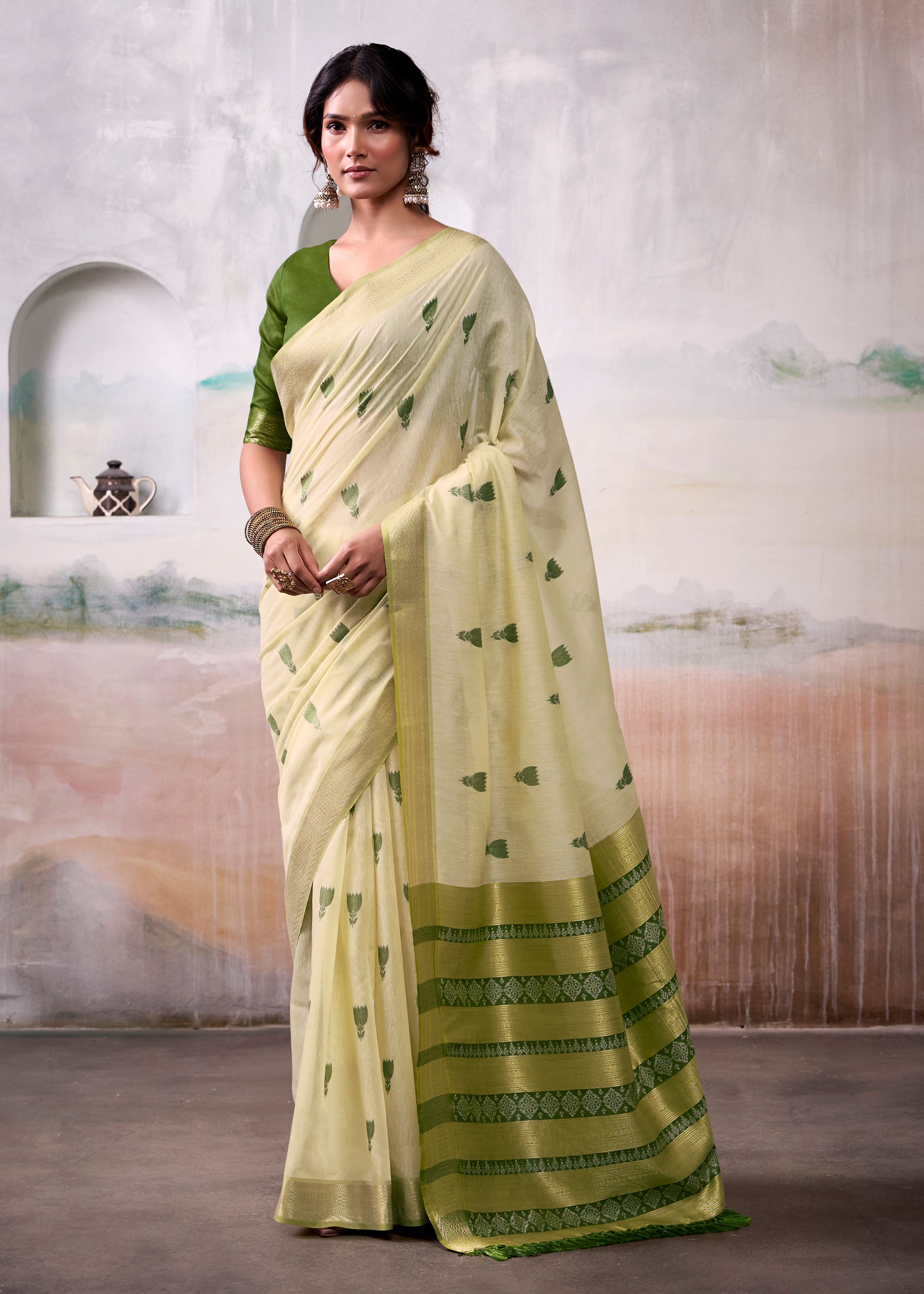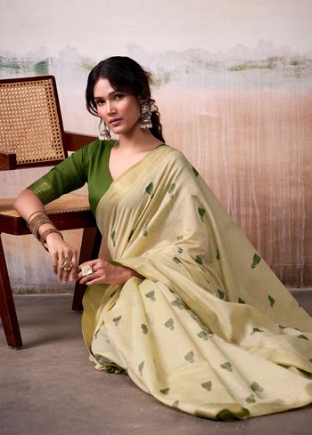 Paired with a mehendi-colored modal cotton blouse, this ensemble creates a pleasing contrast that enhances the delicate yellow tones. The lightweight fabric drapes effortlessly, providing a graceful silhouette while ensuring all-day comfort. Whether attending a wedding function, a party, or a traditional event, this saree is designed to make a refined yet stylish statement.