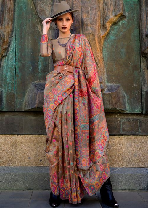 LightCoffee Handloom Organza Saree With Handloom Kashmiri Jacquard Woven Work