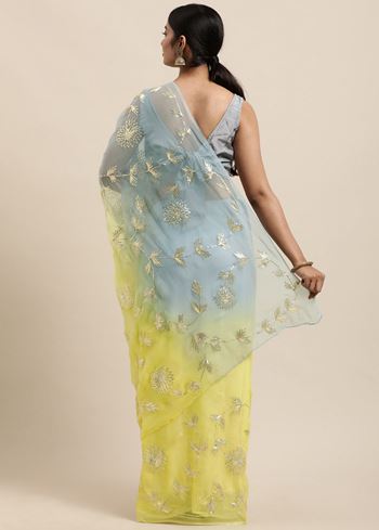 The lively lime base is paired with a contrasting grey silk blend blouse, creating a stylish and sophisticated ensemble. Its lightweight organza fabric drapes gracefully, highlighting the fine embroidery while providing comfort and ease of movement. Designed for women who love a blend of traditional craftsmanship and contemporary style, this saree is ideal for bridal events, festive celebrations, and ceremonial functions.
