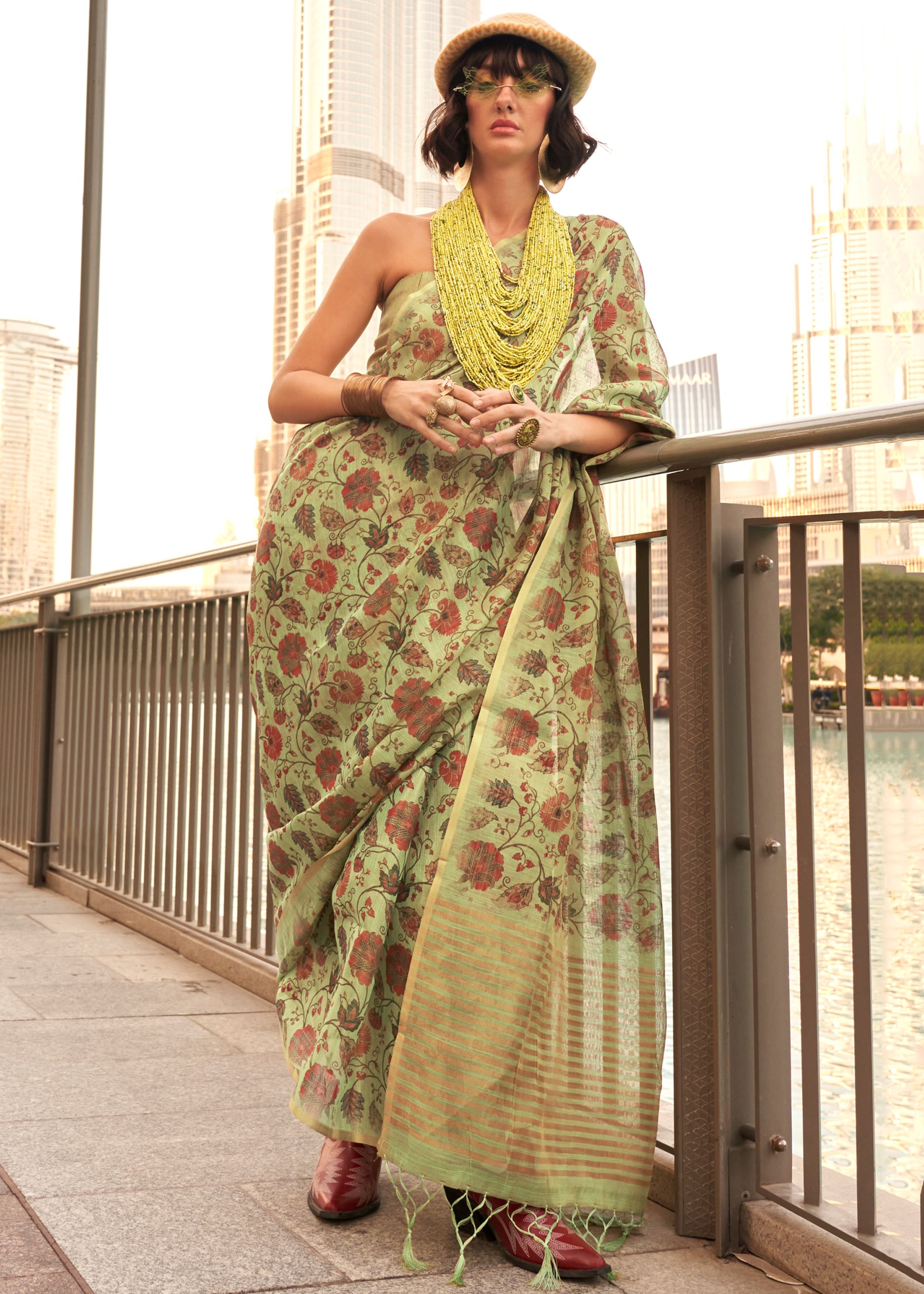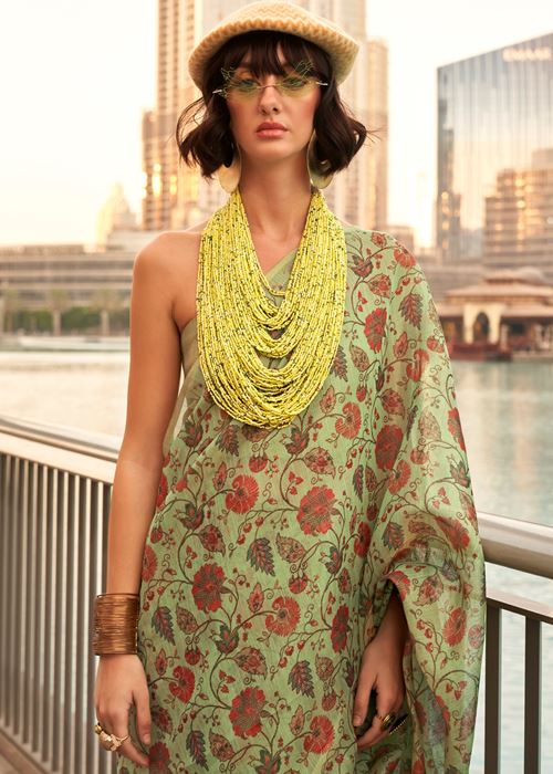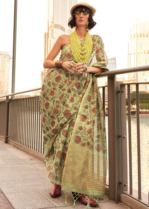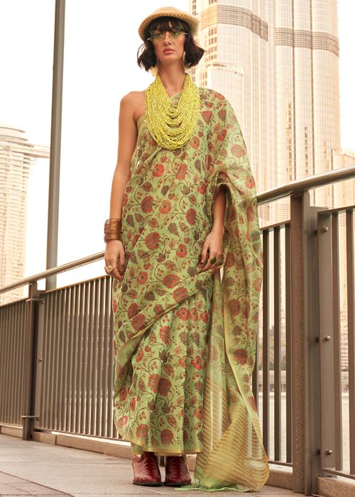 Lime Green Tissue Silk Saree With Printed