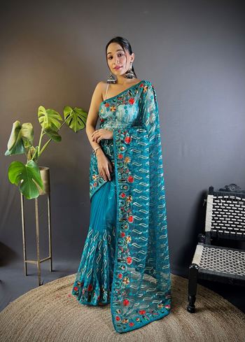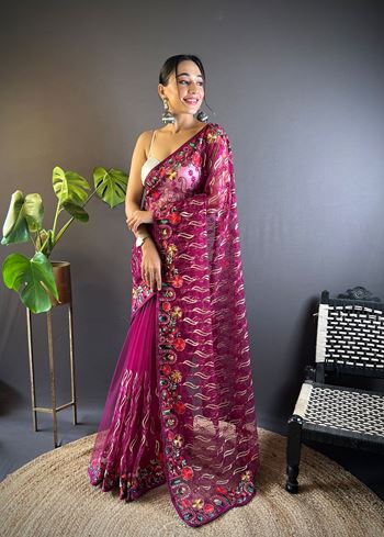 This saree comes with a matching magenta net blouse, designed to complement the embroidered details of the drape seamlessly. The soft, breathable net fabric allows effortless draping and ensures all-day comfort, so you can carry your look with ease and elegance. Pair it with statement earrings, high heels, and a stylish clutch to create a glamorous ensemble that blends traditional beauty with a modern touch.