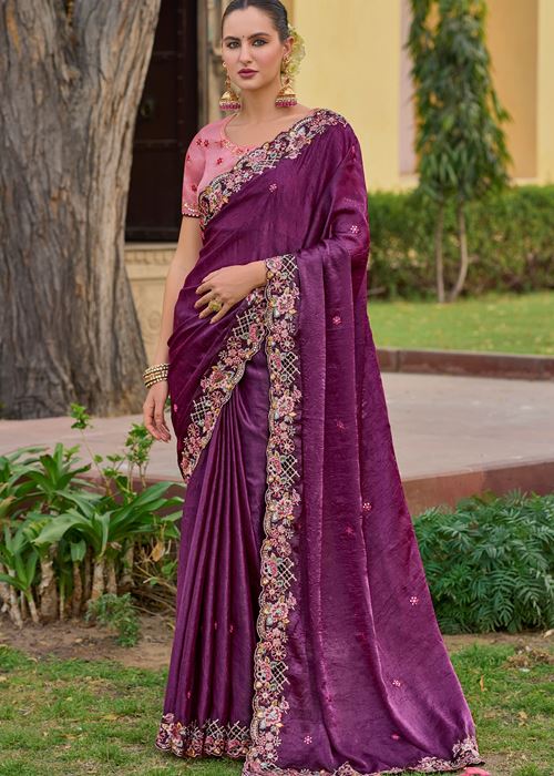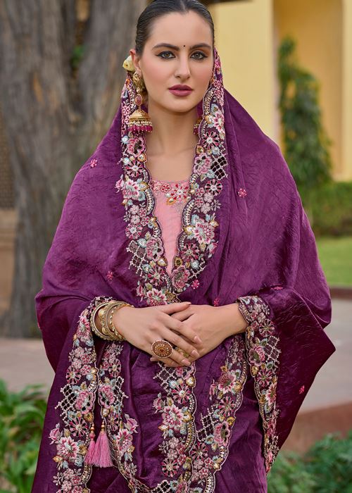 Magenta Organza Silk Saree With Heavy Thread Embroidery With Sequins Work