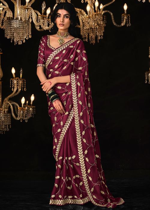 Magenta Tissue Silk Saree With Heavy Thread and Zari Embroidered Work