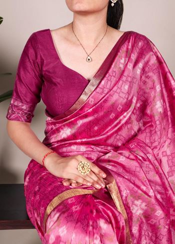 The vibrant magenta hue radiates charm and sophistication, enhanced by intricate weaving patterns that showcase timeless craftsmanship. The highlight of this saree is its lustrous zari weaving border, which adds a regal touch and elevates the overall appeal. Completing the look, the pallu is adorned with delicate fancy tassels, giving the saree a graceful and contemporary finish.