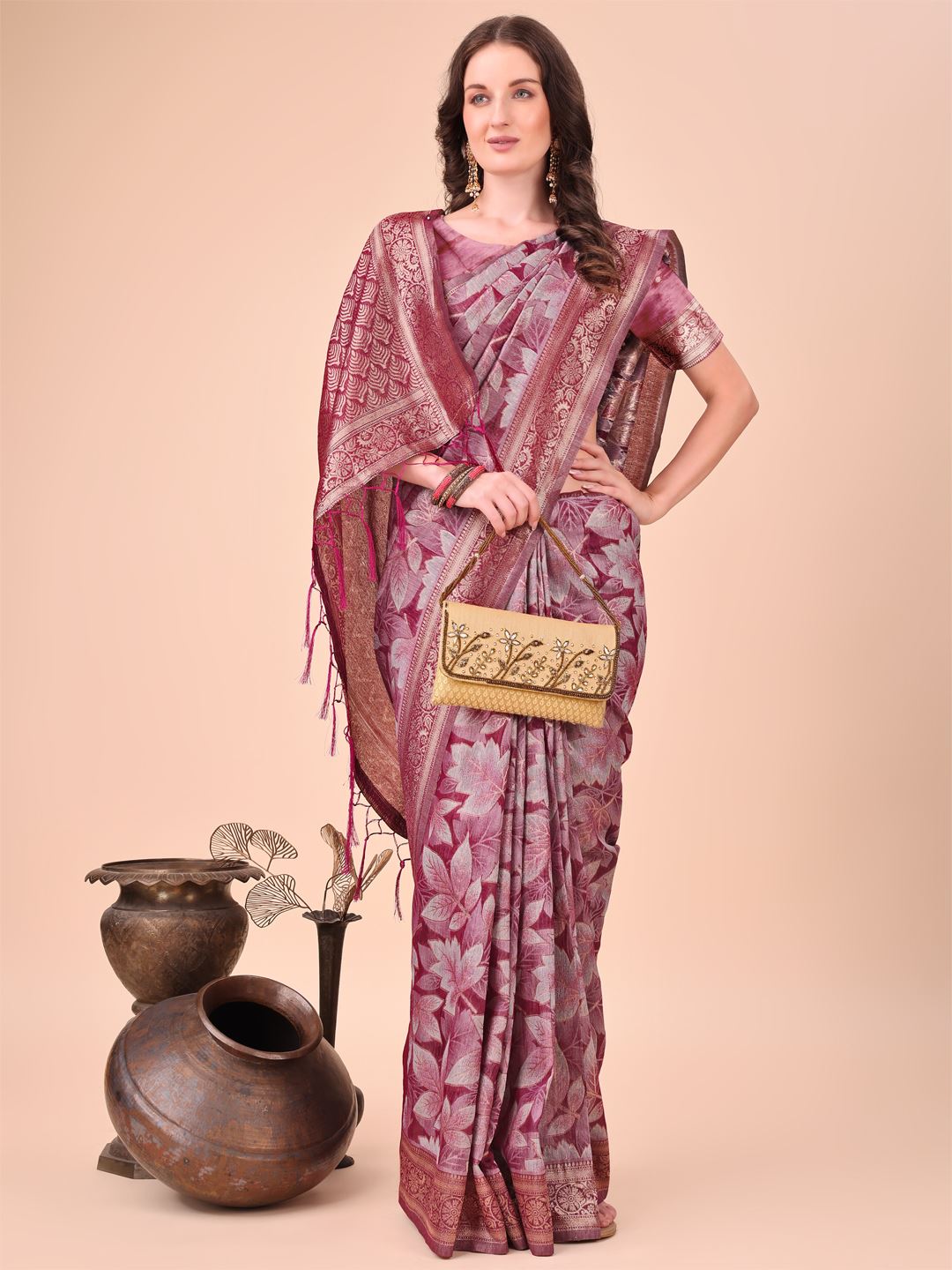 Magenta Woven Jacquard Designer with Floral Printed Cotton Ceremonial Saree