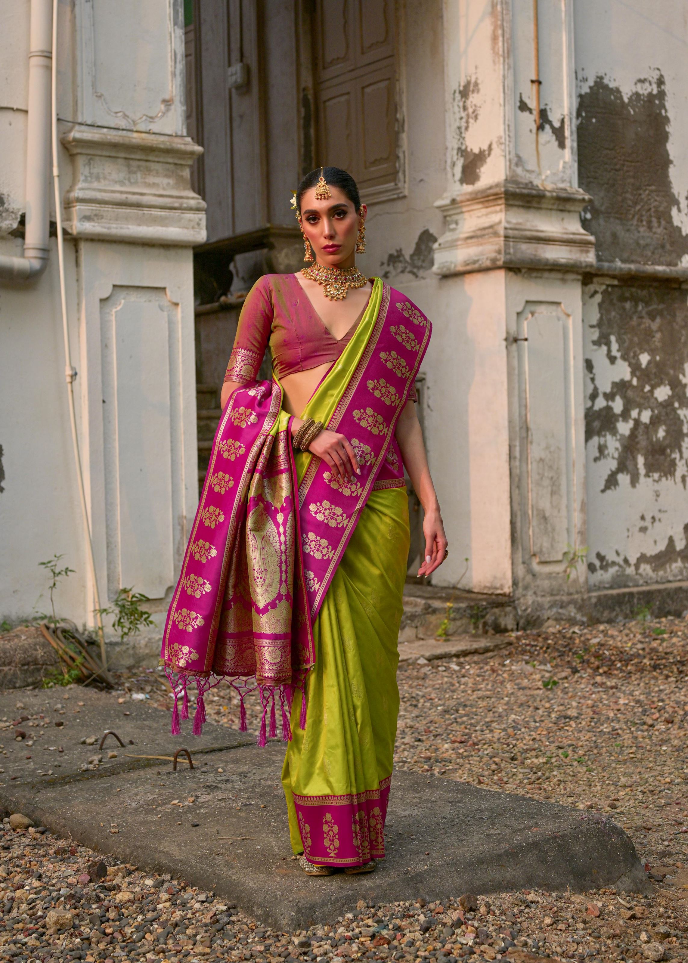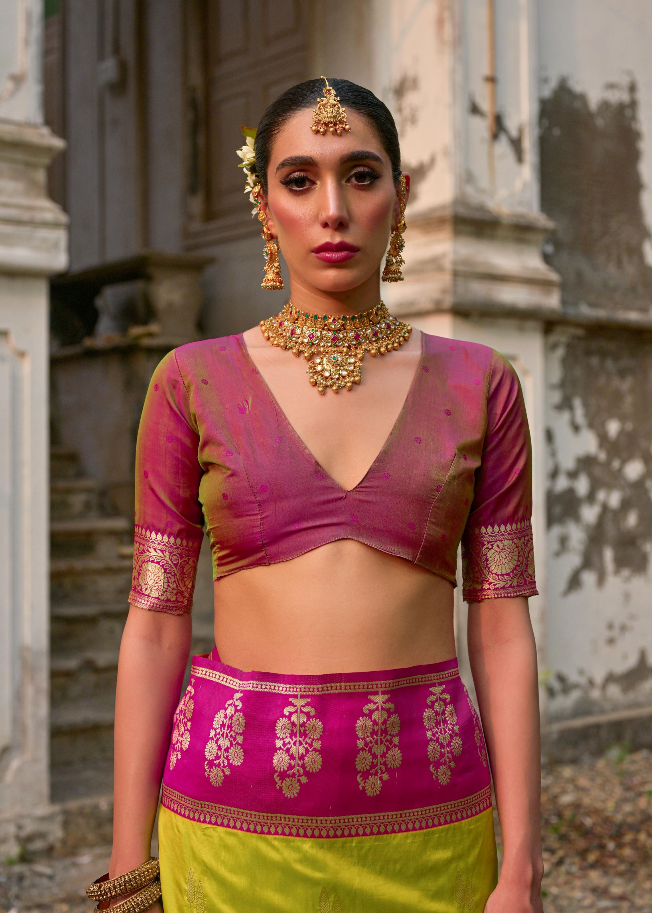 Complementing the saree is a contrasting pink silk blend blouse, which enhances its festive appeal and creates a vibrant combination. The fabric drapes beautifully, offering a luxurious fall while remaining light enough to wear comfortably through long hours of festivity.Style it with antique gold jewelry, chandbali earrings, or layered necklaces to highlight its richness. Pair it with embroidered juttis or traditional heels to complete your look. Perfect for bridesmaids, festive celebrations, or ceremonial events, this saree is a true statement of tradition and class.