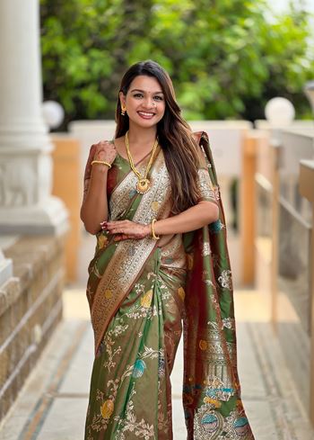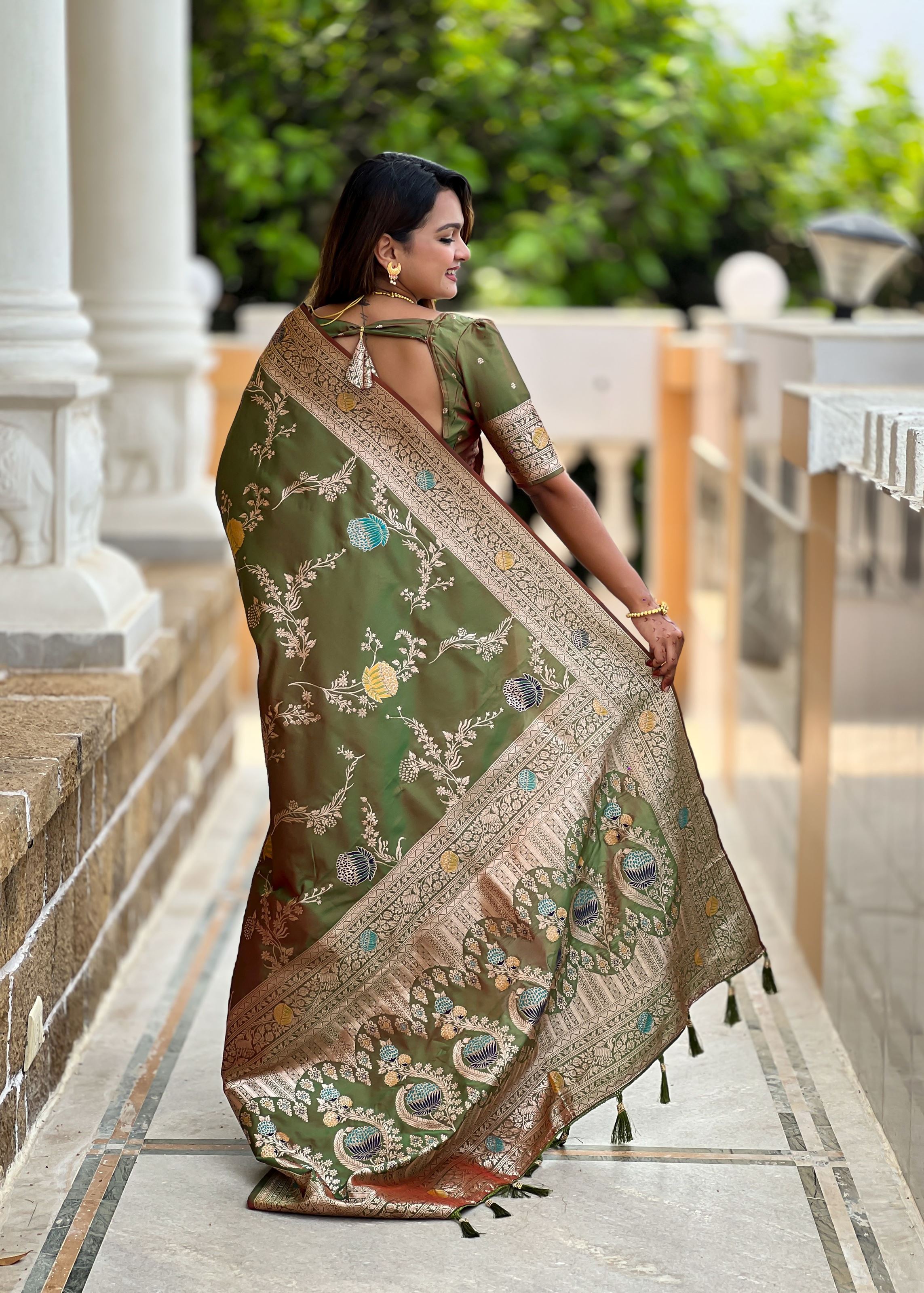 Mahendi Beautiful Banarasi Silk Woven Meenakari Designer Graceful Ethnic Saree