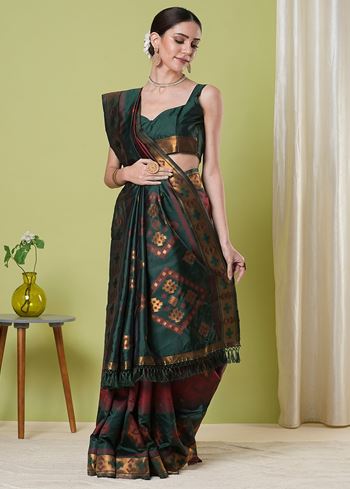 The intricately woven patterns enhance the saree’s luxurious appeal, combining traditional elegance with a modern touch. Lightweight yet sumptuous, it drapes gracefully, offering comfort and poise throughout long events. The matching silk blouse completes the look, ensuring a coordinated and polished appearance that radiates refinement and charm.