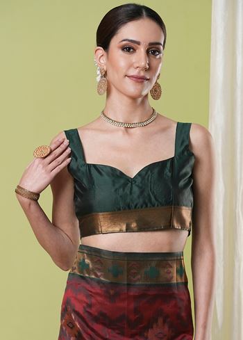 Step into elegance with the Maroon Banarasi Silk Woven Jacquard Designer Saree from Aethnofit Fashions. Made from premium silk, this saree features intricate woven jacquard designs that reflect the timeless artistry and heritage of Banarasi craftsmanship. The deep maroon shade paired with a contrasting green silk blouse creates a striking and sophisticated ensemble, perfect for weddings, festive occasions, and special celebrations.
