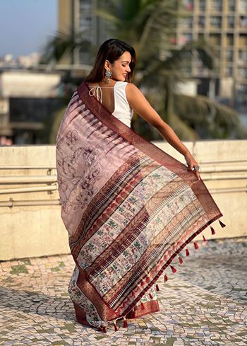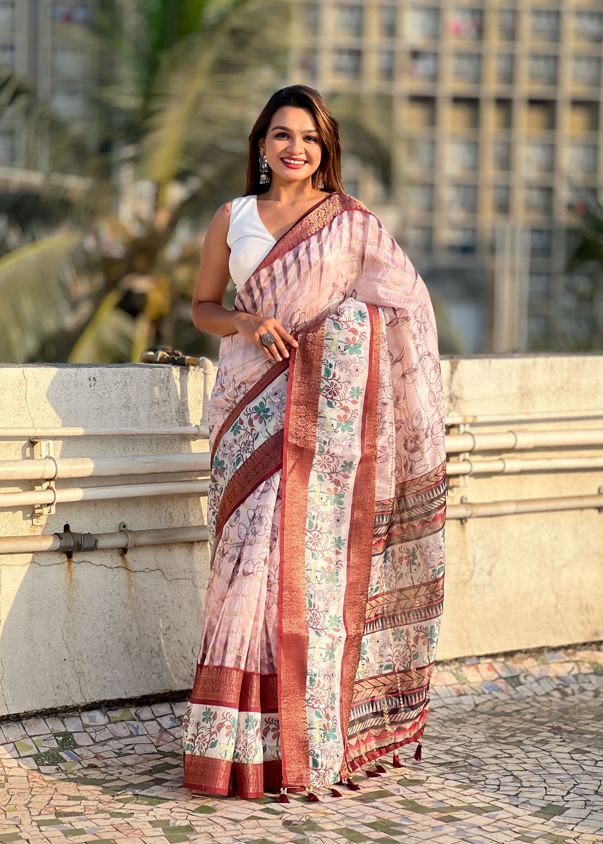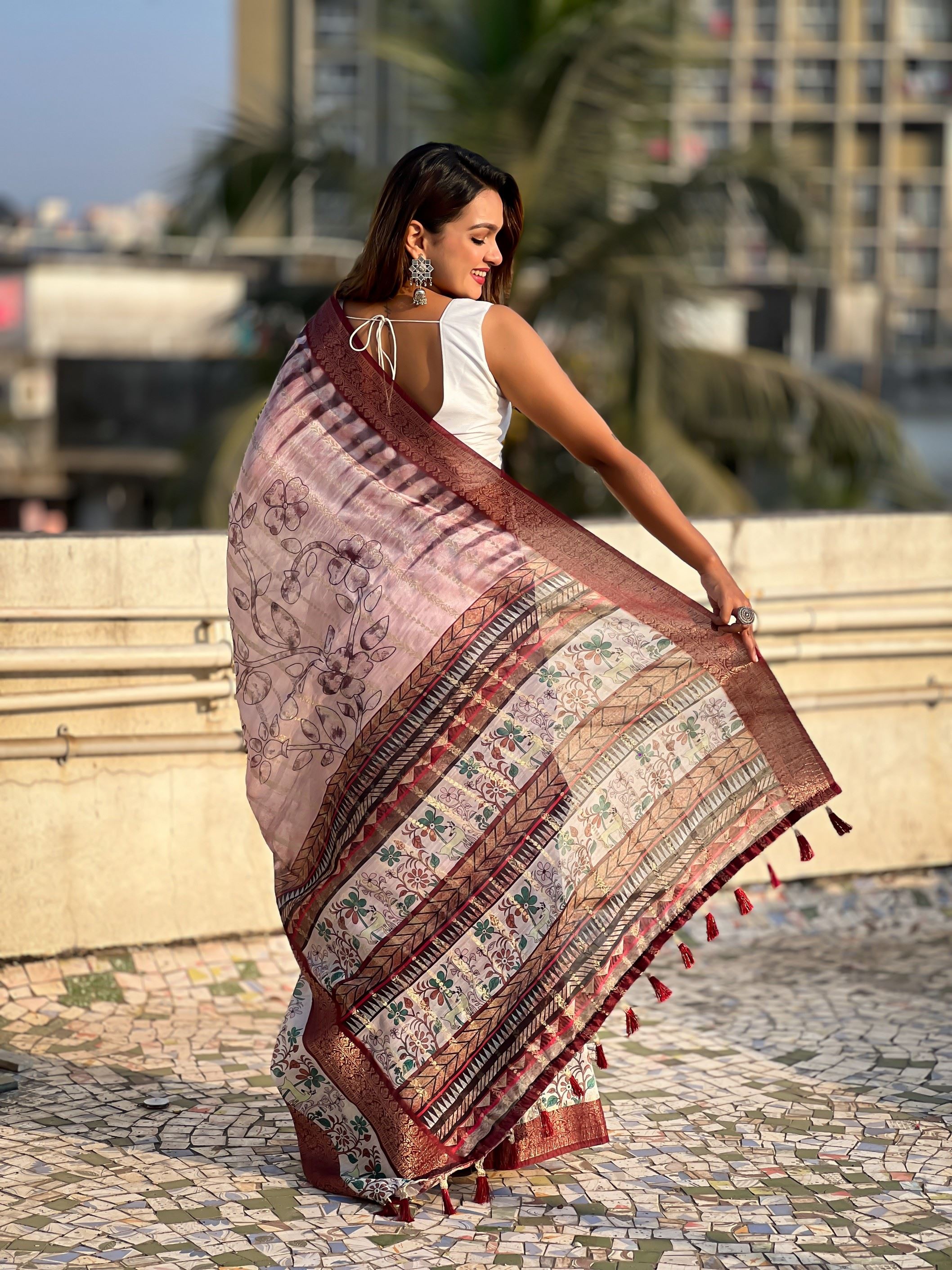 The deep maroon shade symbolizes richness and poise, perfect for festive occasions, weddings, and cultural gatherings. The crush-printed effect enhances the texture of the fabric, while the intricately woven jari detailing elevates the look, giving it a designer touch with a regal essence.