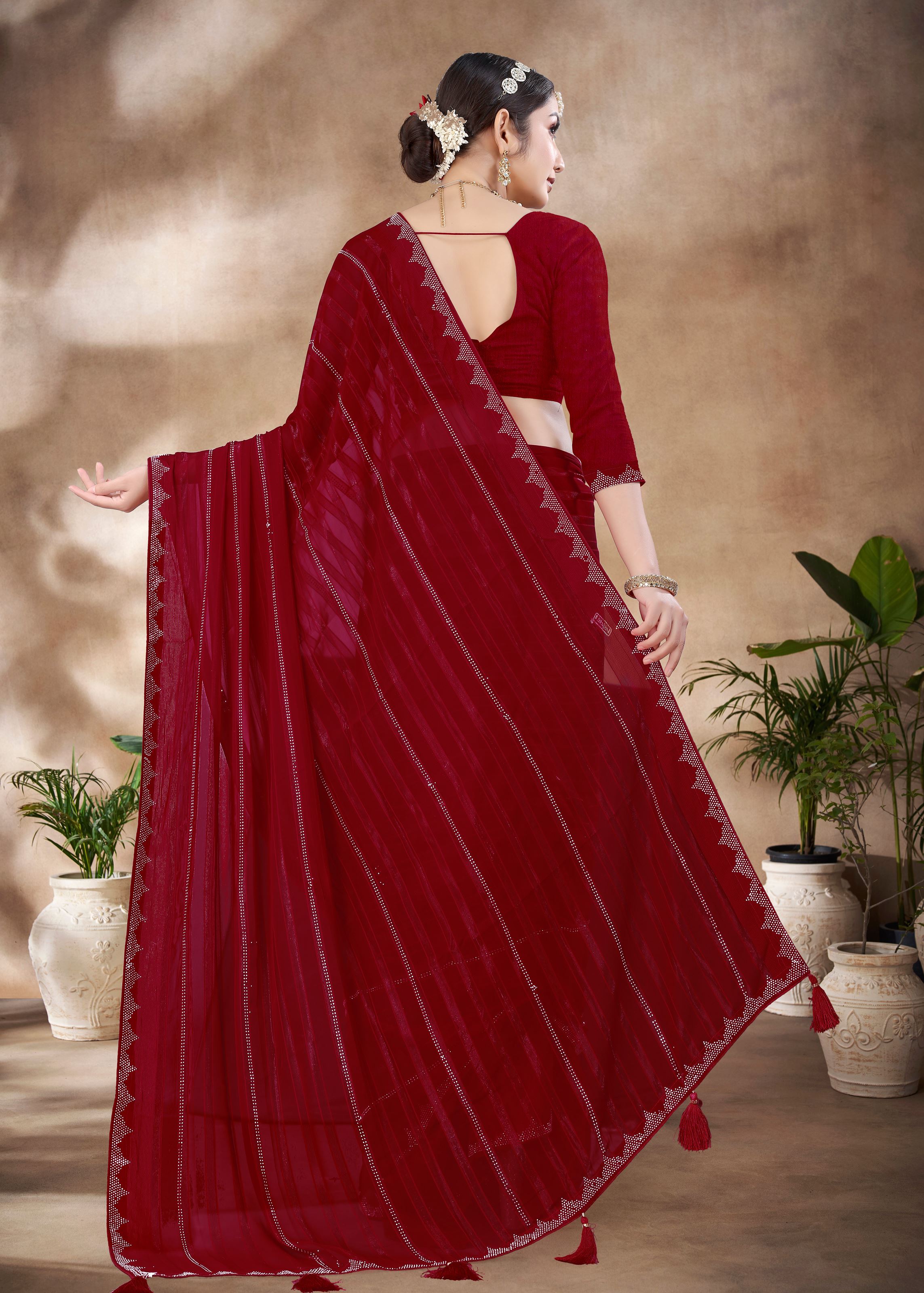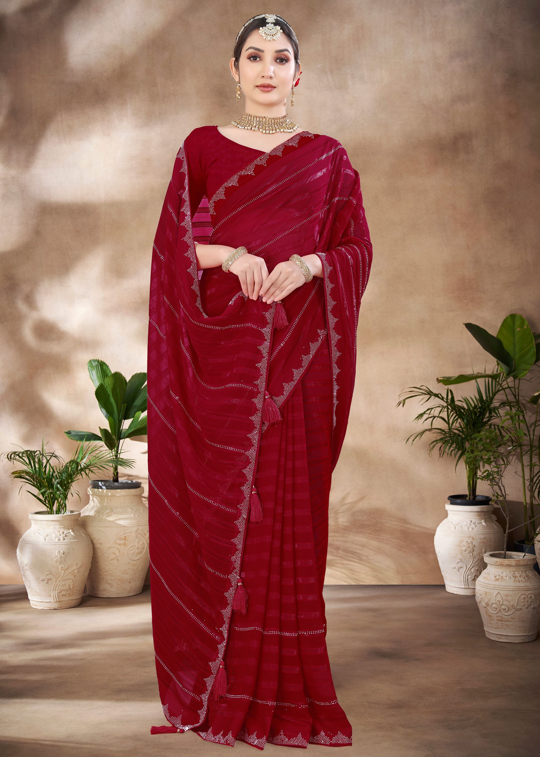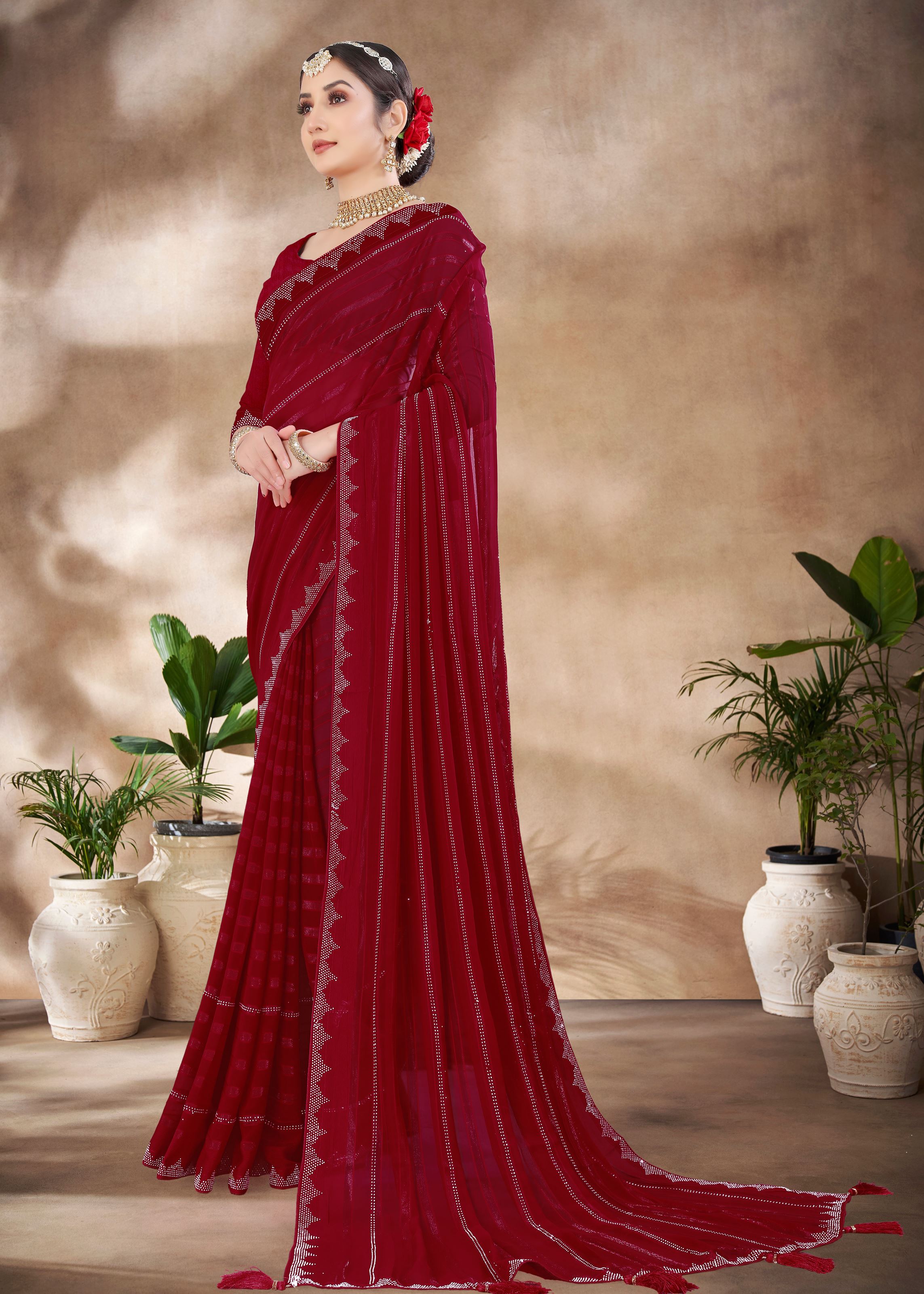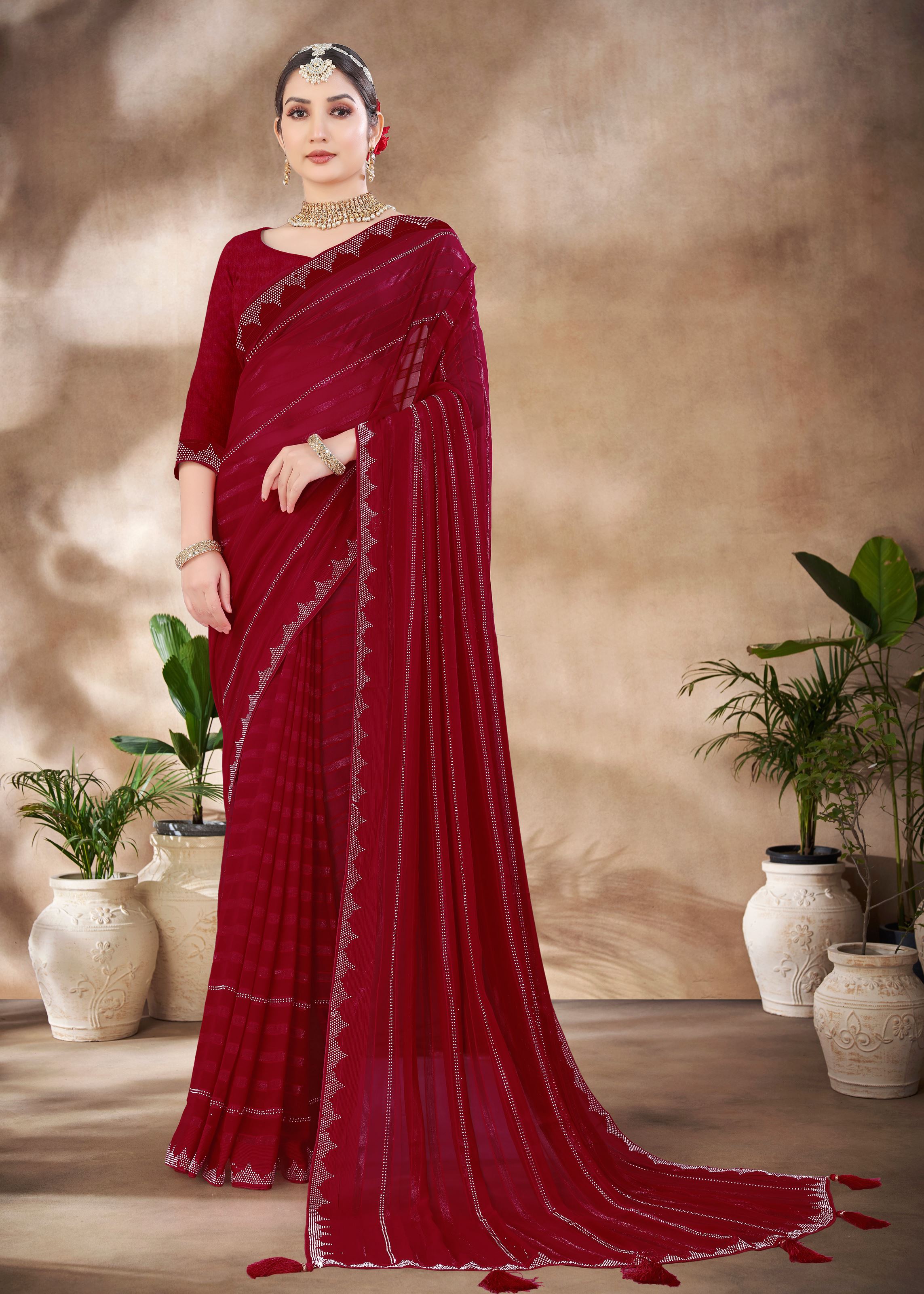 Maroon Chiffon Saree With Swarovski Diamond Work