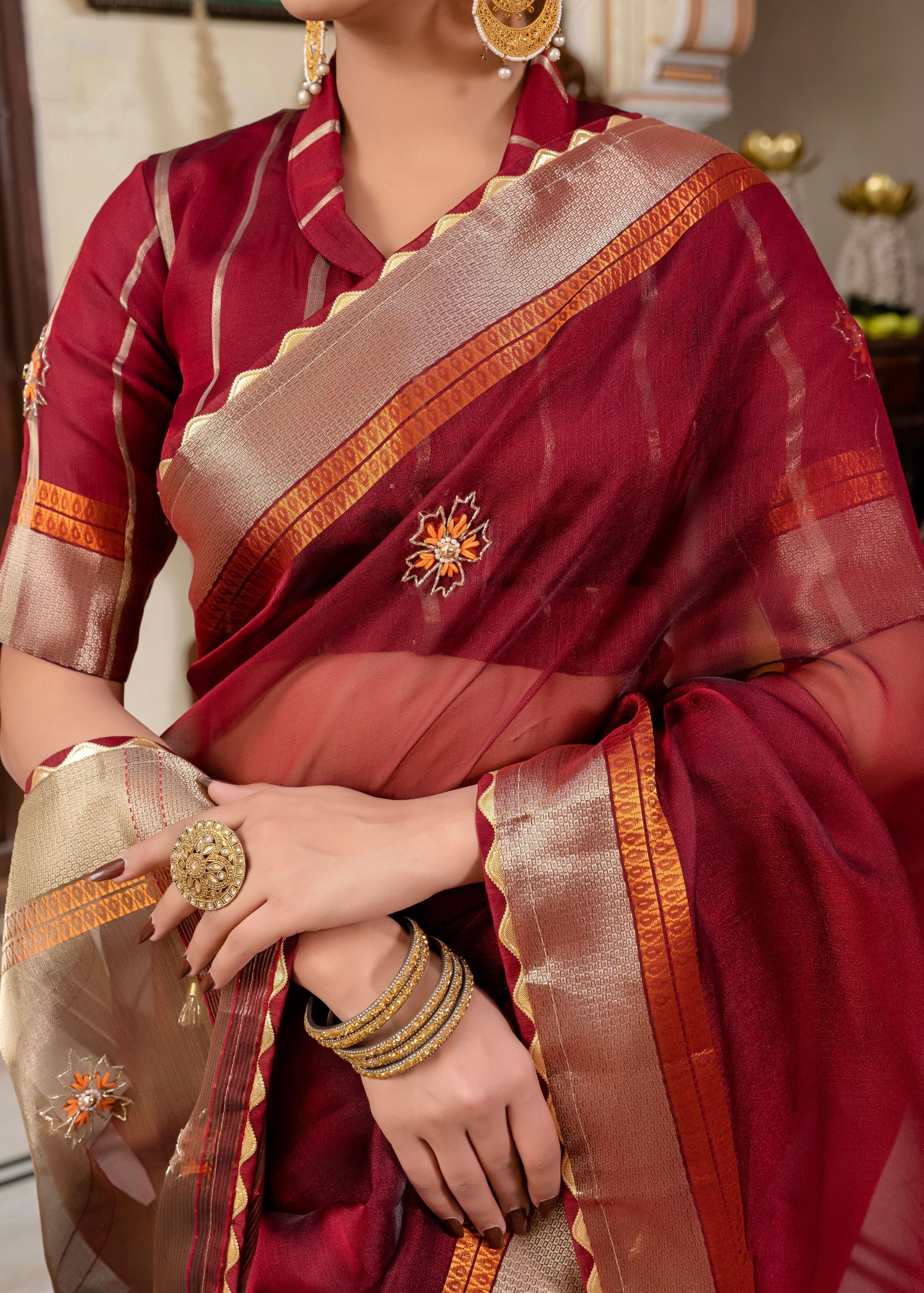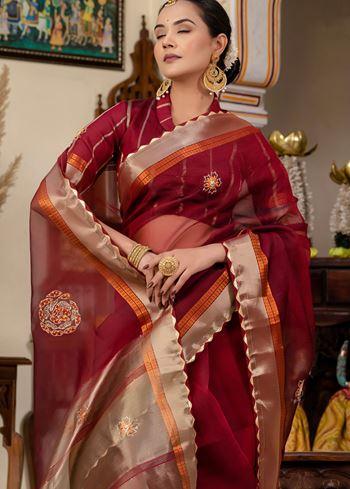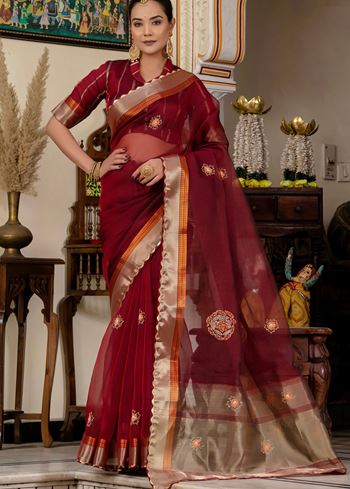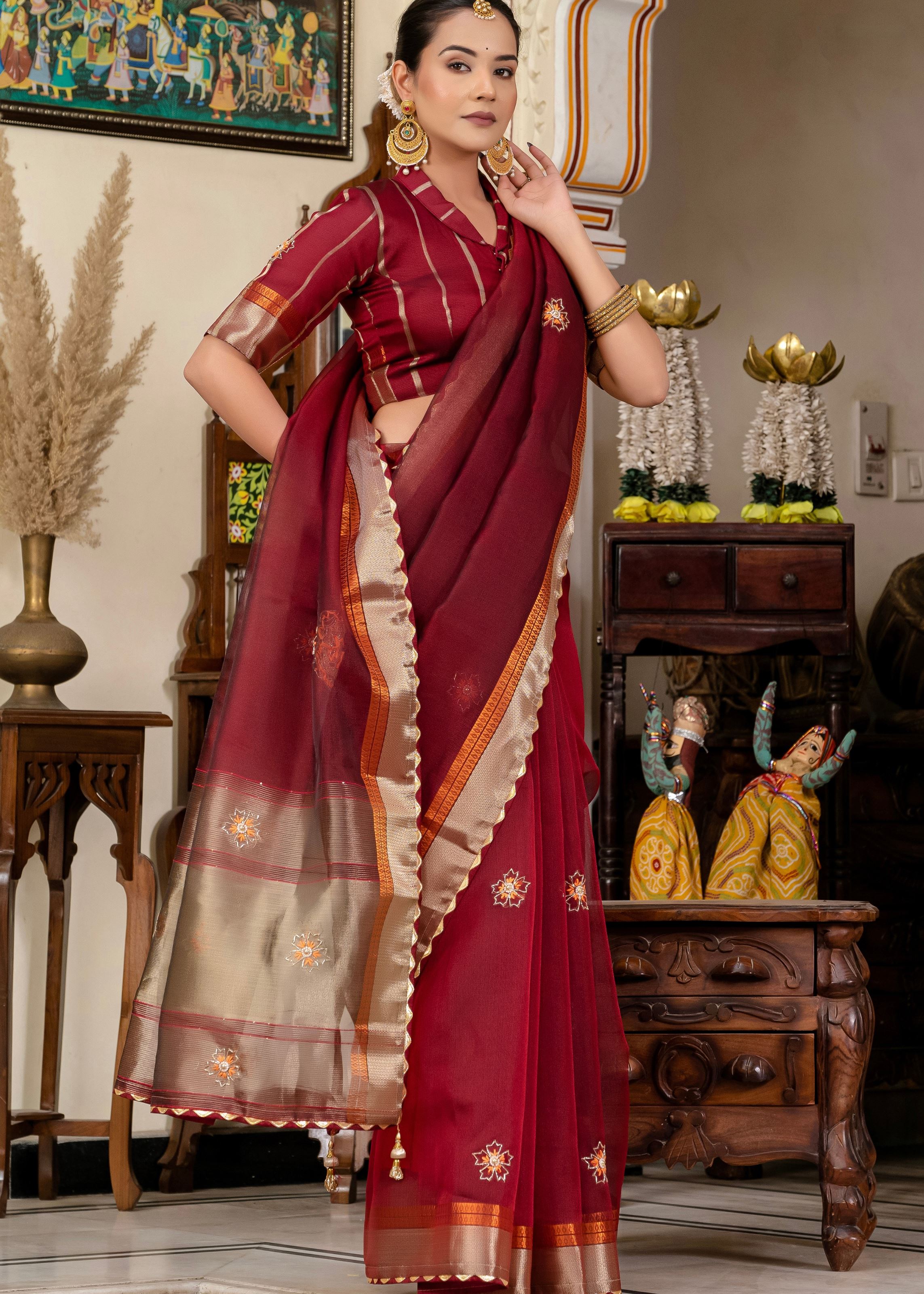 Maroon Color Kota Linen Saree with Handwork Butta, Zari Woven Patta & Sequins-Touched Pallu