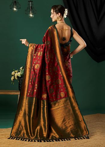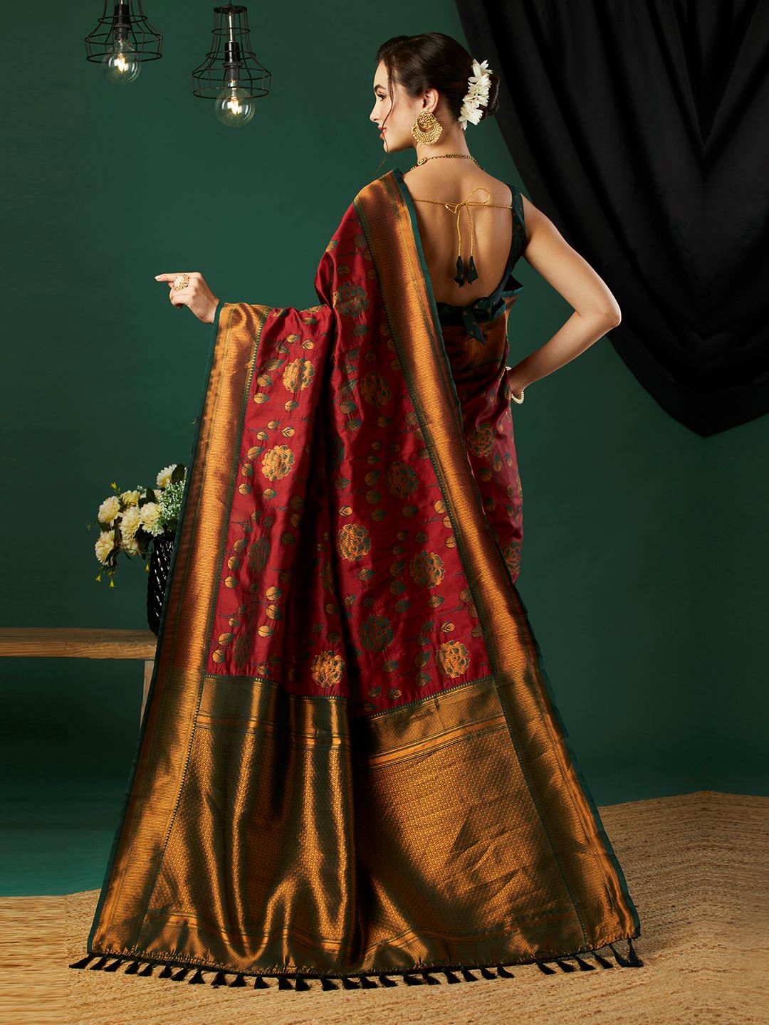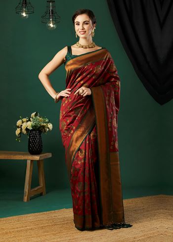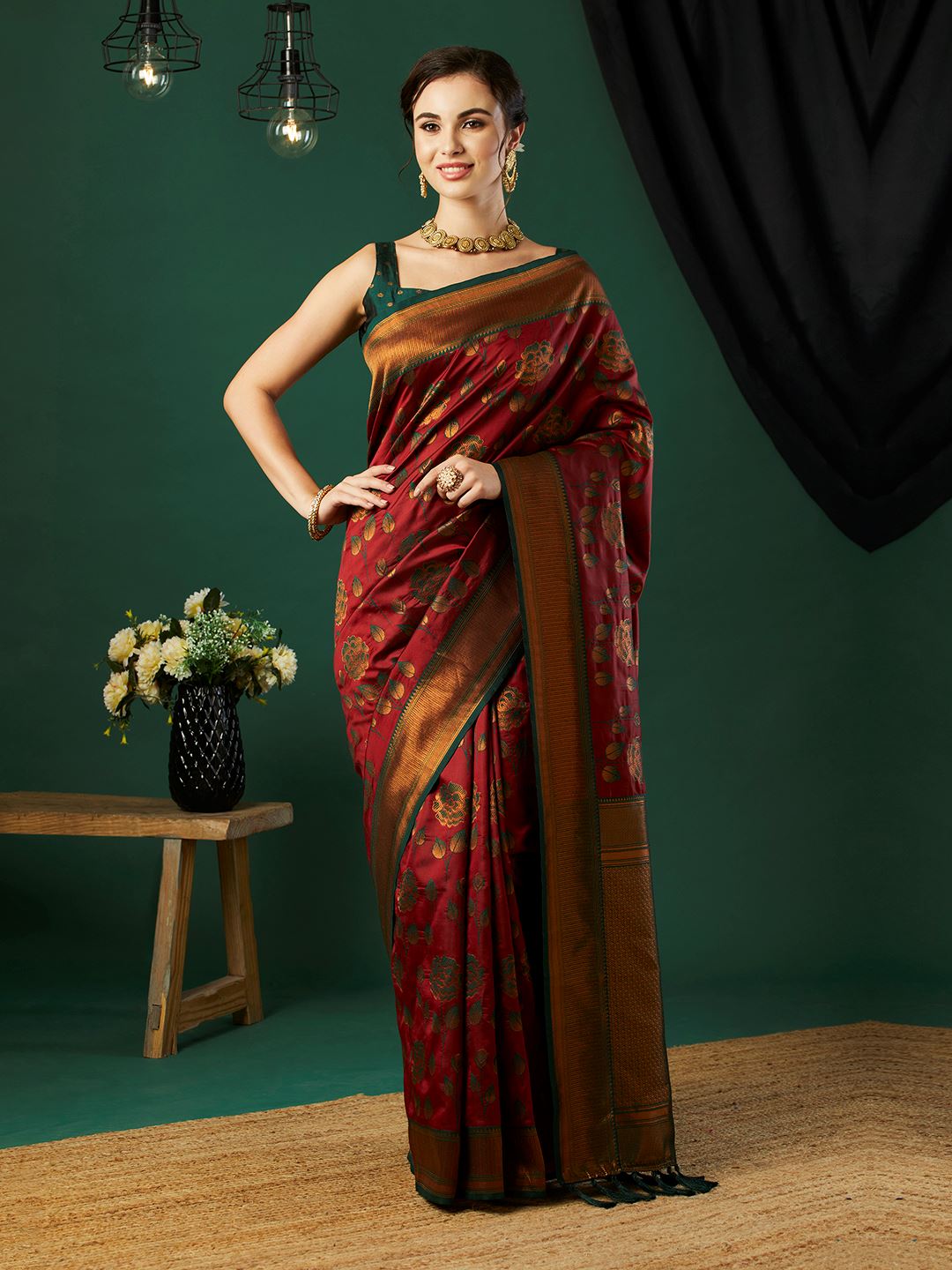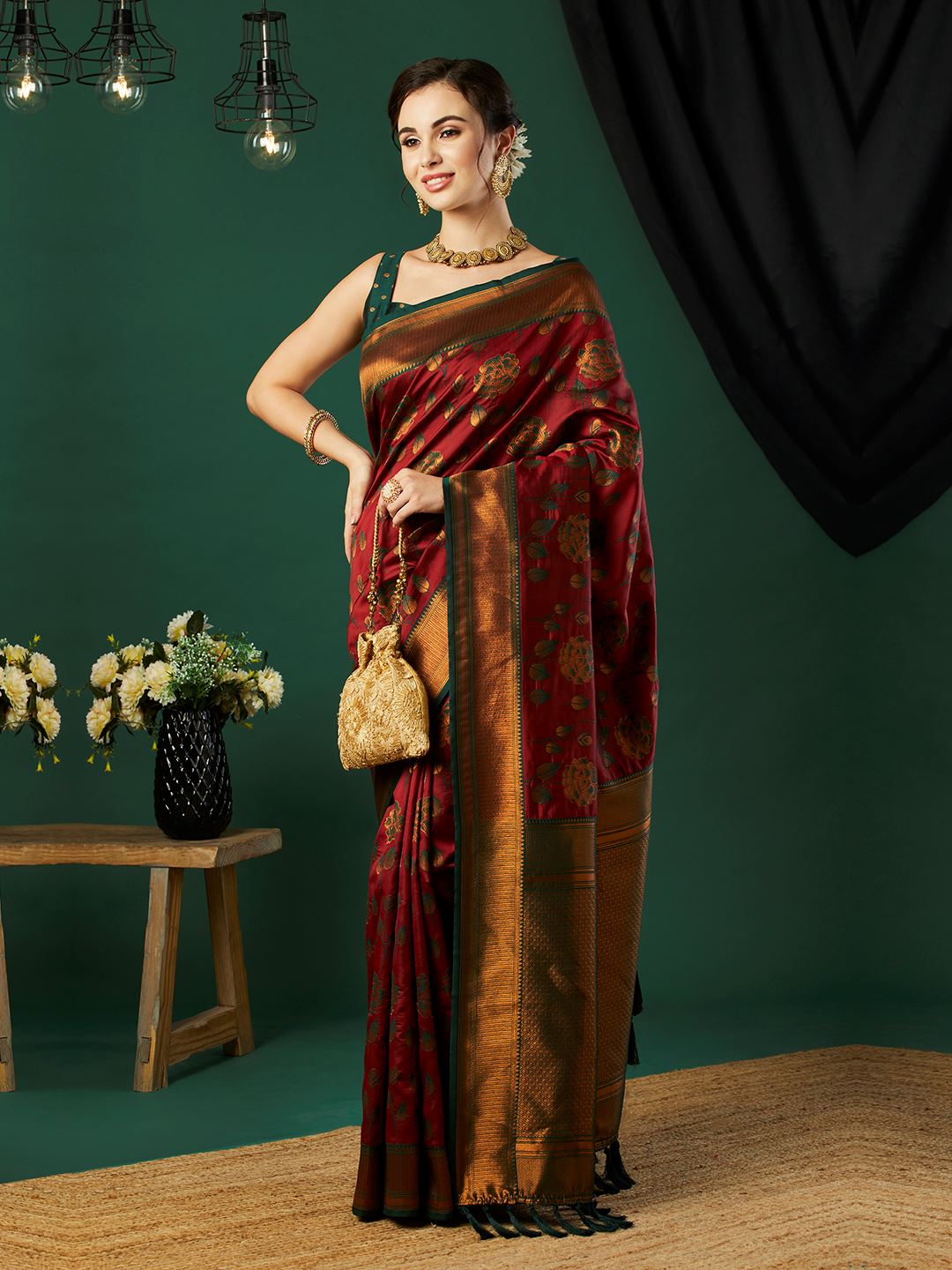 Maroon Ethnic Banarasi Silk Saree With Floral Woven Designer Looks