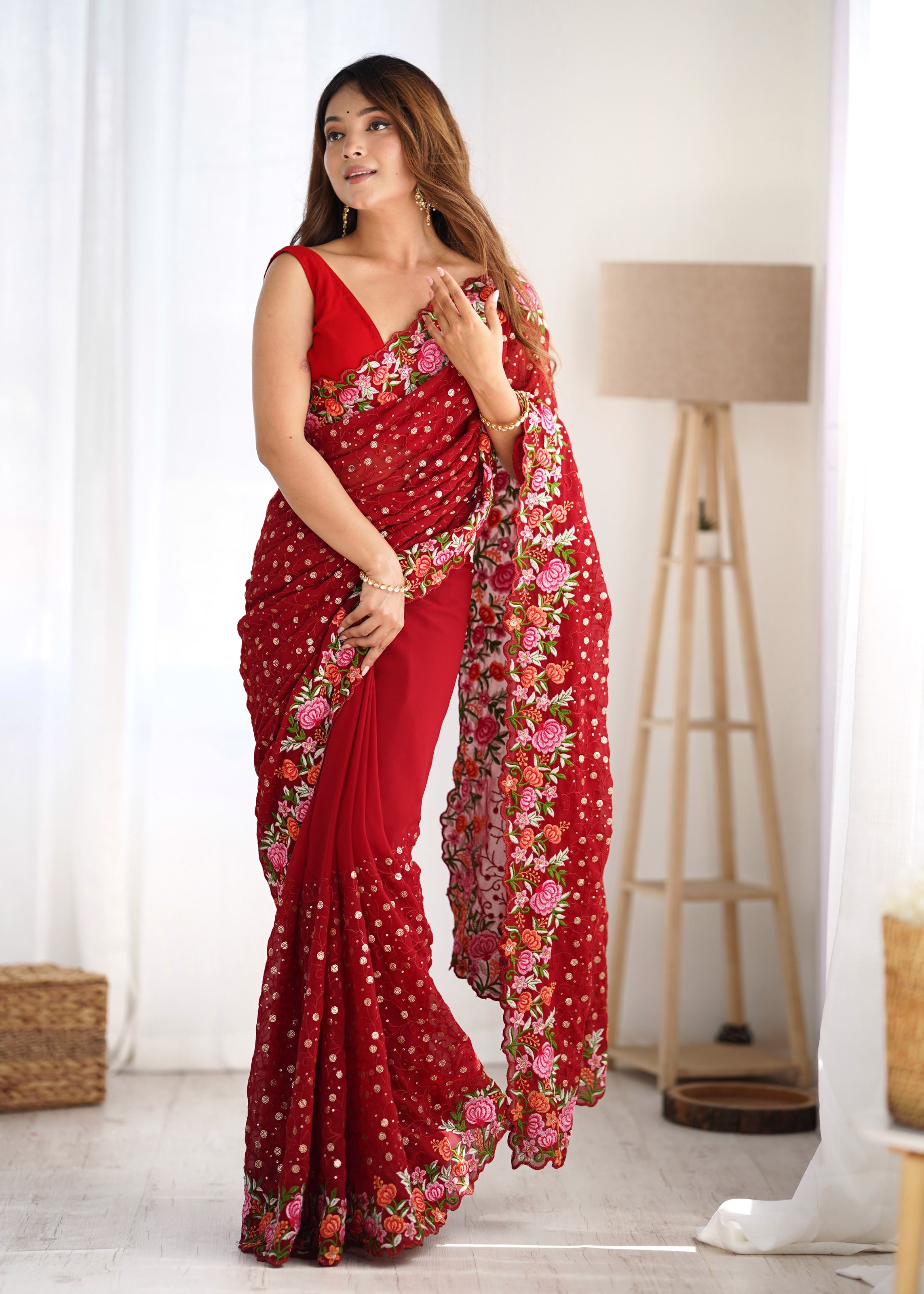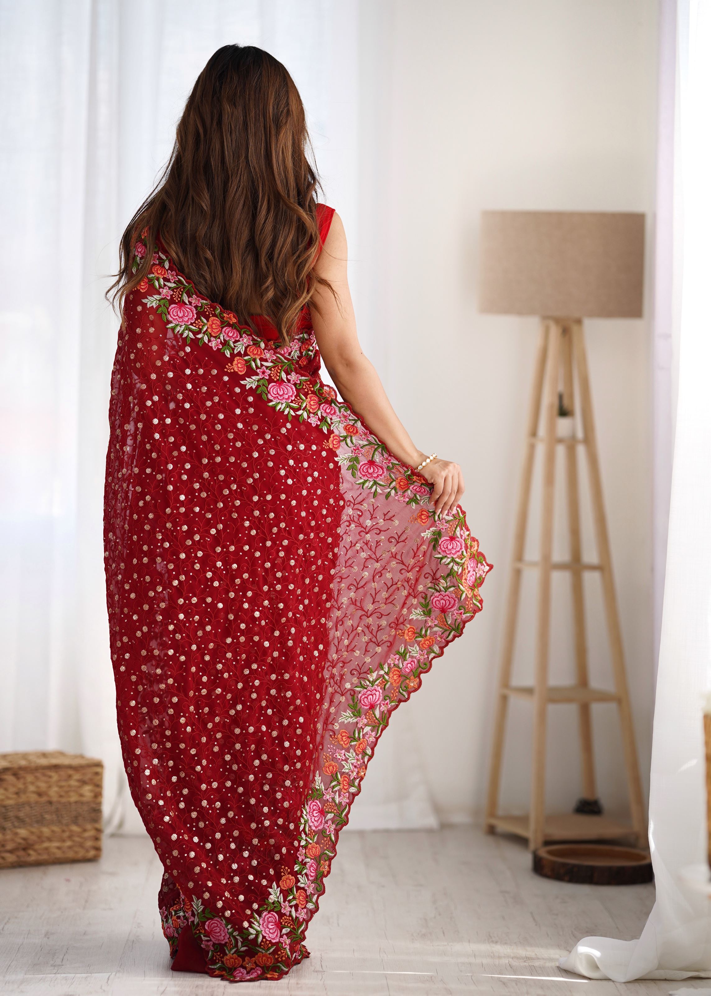 Maroon Georgette Fabric Designer Sequins Work Embroidery Saree