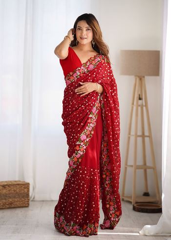 The ensemble comes with a matching maroon art silk blouse, embroidered with sequins for a complete designer look. Its lightweight georgette fabric ensures easy draping, graceful movement, and all-day comfort without compromising on style. Whether styled with heavy bridal jewelry or chic minimalist accessories, this maroon saree will turn every head your way.
