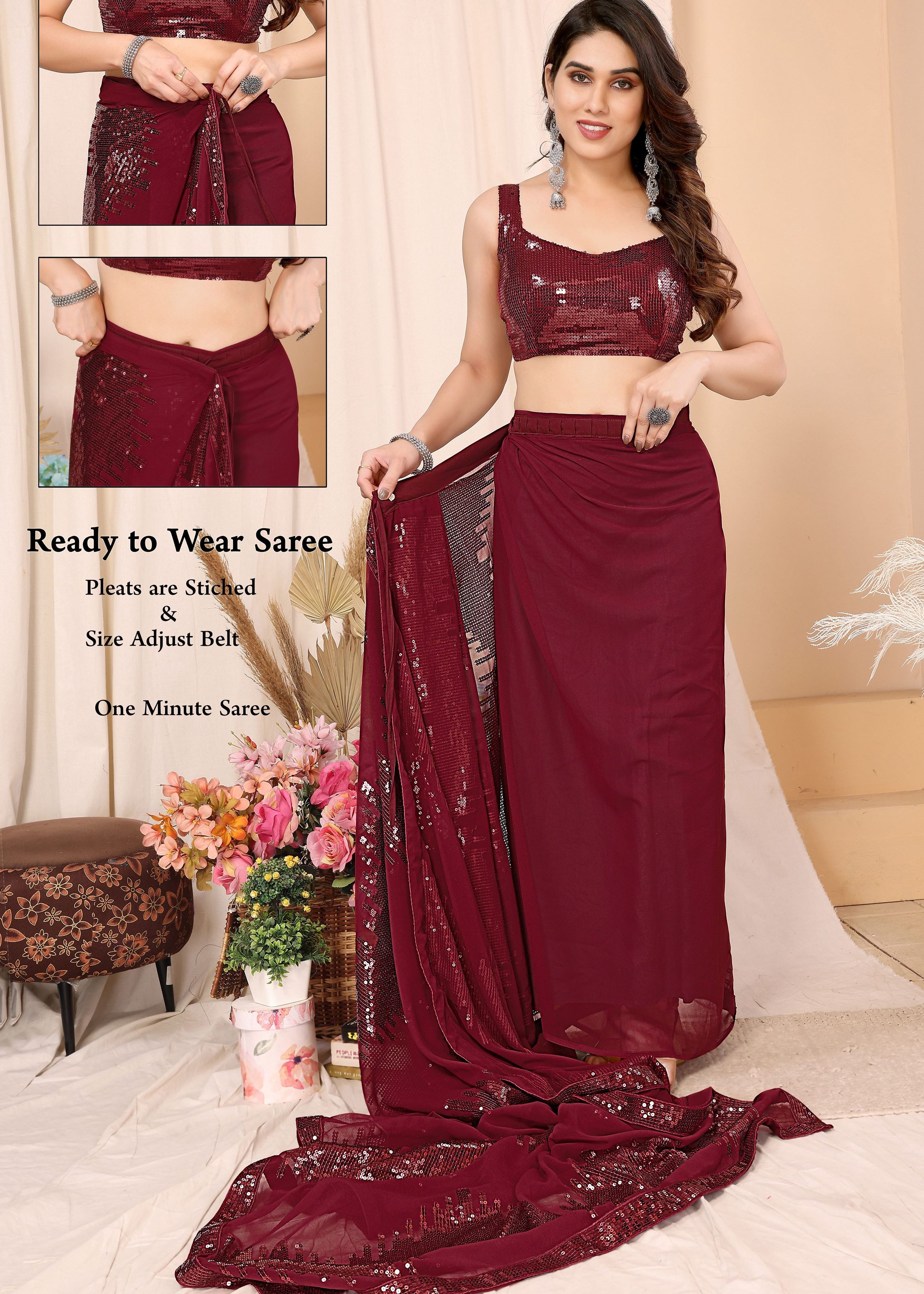 Maroon Georgette Ready To Wear Sequins Embroidered Saree