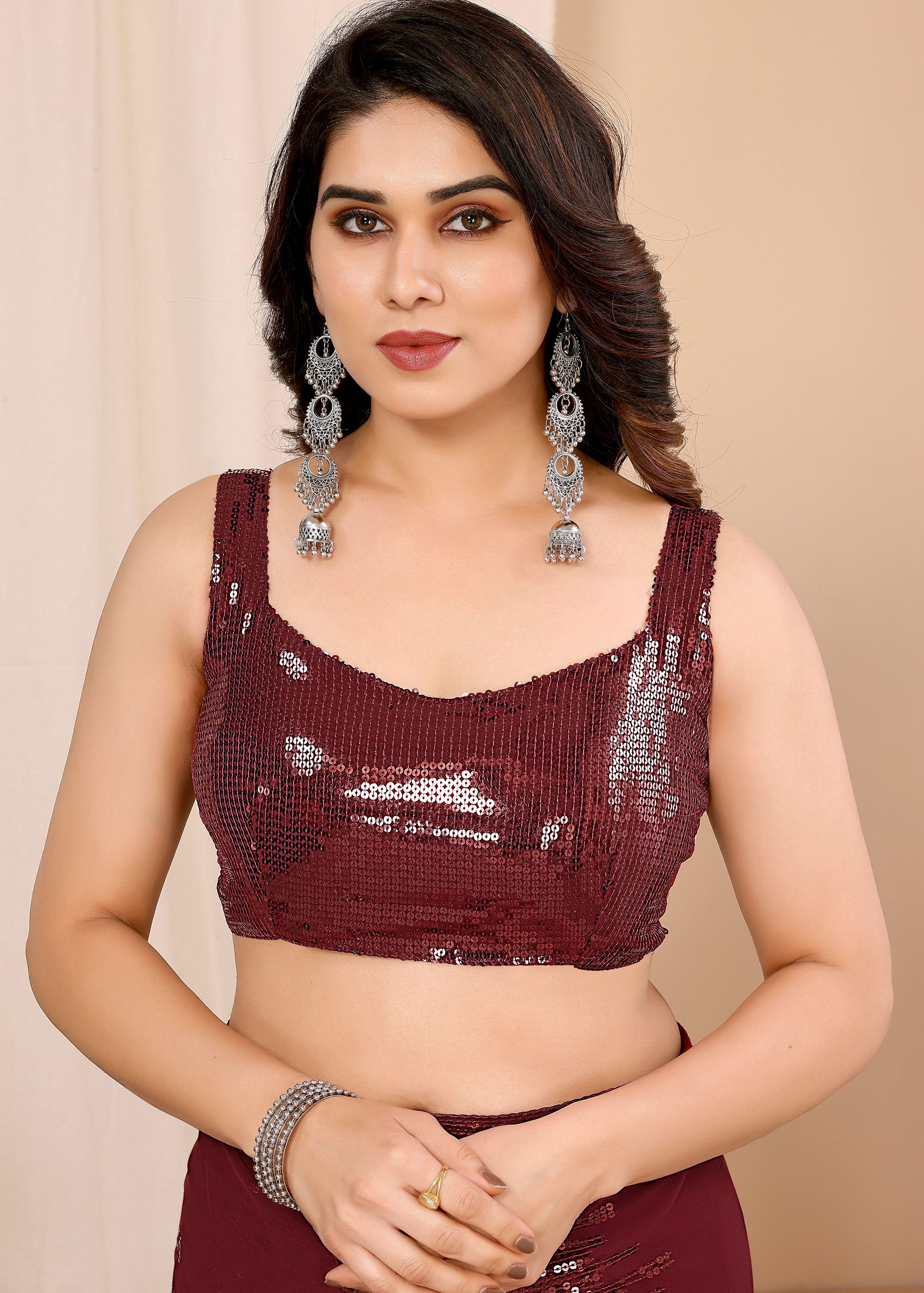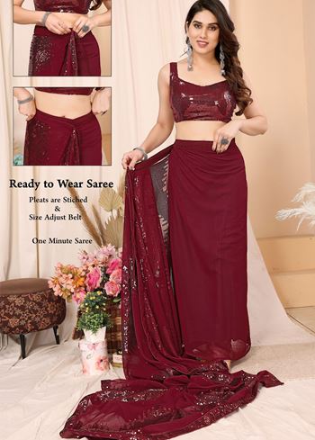 Make an unforgettable style statement with this Maroon Georgette Ready-To-Wear Sequins Embroidered Saree, crafted for women who love elegance with convenience. Made from premium faux georgette fabric, this saree offers a lightweight and breathable drape that flows beautifully, giving you a regal look without compromising on comfort.