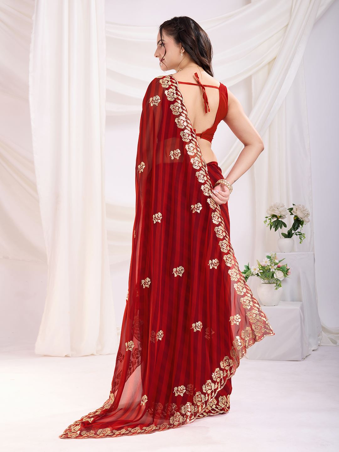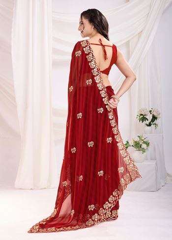 Paired with a matching maroon art silk blouse, the ensemble strikes the perfect balance of modern style and traditional sophistication. The embroidered details add finesse, making this saree a versatile choice for weddings, receptions, cocktail nights, and festive parties. If you’re looking to buy Bollywood sarees online, embroidered georgette sarees, or premium designer party wear, this stunning piece ensures you stand out with confidence and allure.