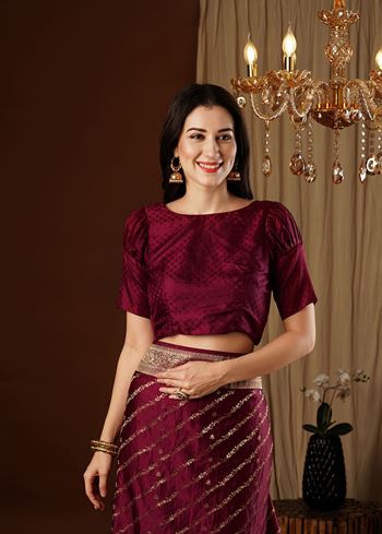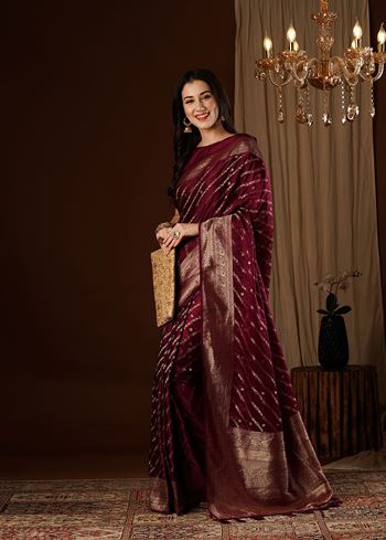 This saree not only looks regal but also feels comfortable to wear, with a lightweight drape that falls gracefully. The elegant woven detailing and glossy satin silk base make it versatile enough to be styled with statement jewelry—be it antique gold, dazzling stones, or pearls—for a striking appearance.Step into any celebration radiating confidence and poise. Whether it’s for a wedding function, festive gathering, or grand party, this maroon jacquard satin silk saree promises to make you the center of attention.