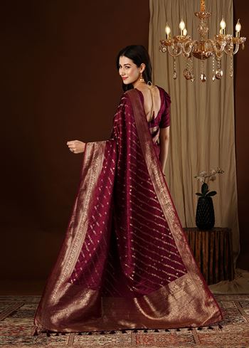 The saree features intricate jacquard woven designs, highlighting the artistry of traditional weaving techniques with a contemporary flair. Each motif adds depth and character, enhancing the saree’s overall glamour. Paired with a matching maroon satin silk blouse, it ensures a perfectly coordinated look that exudes timeless charm.