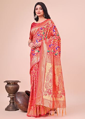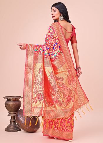 The rich maroon shade gives it a regal look, perfect for weddings, festive celebrations, and special occasions. Detailed with woven work, the saree reflects impeccable craftsmanship and a traditional charm that blends beautifully with modern fashion trends. The intricate design enhances its appeal, making it a versatile choice for both formal and festive events.