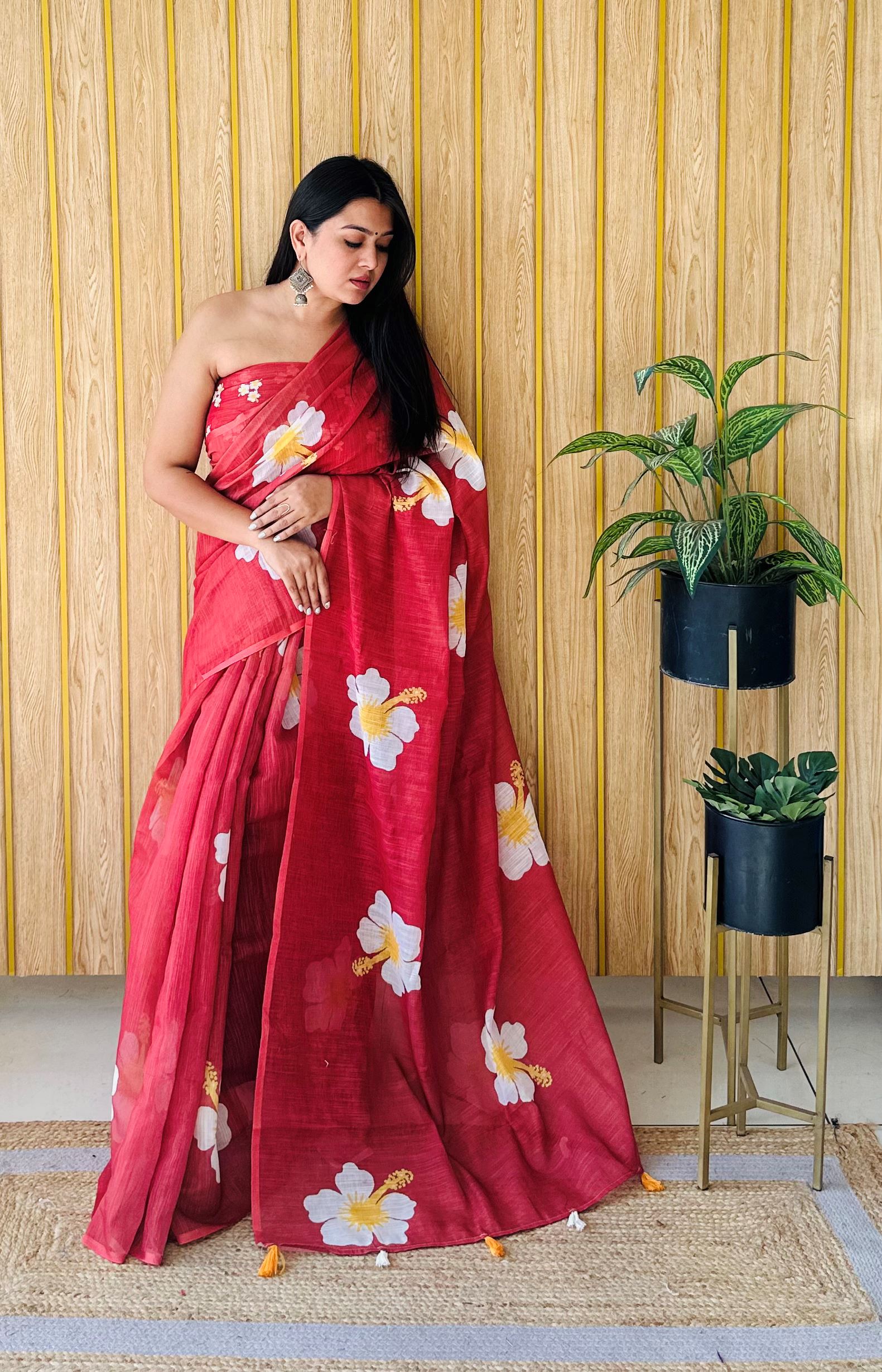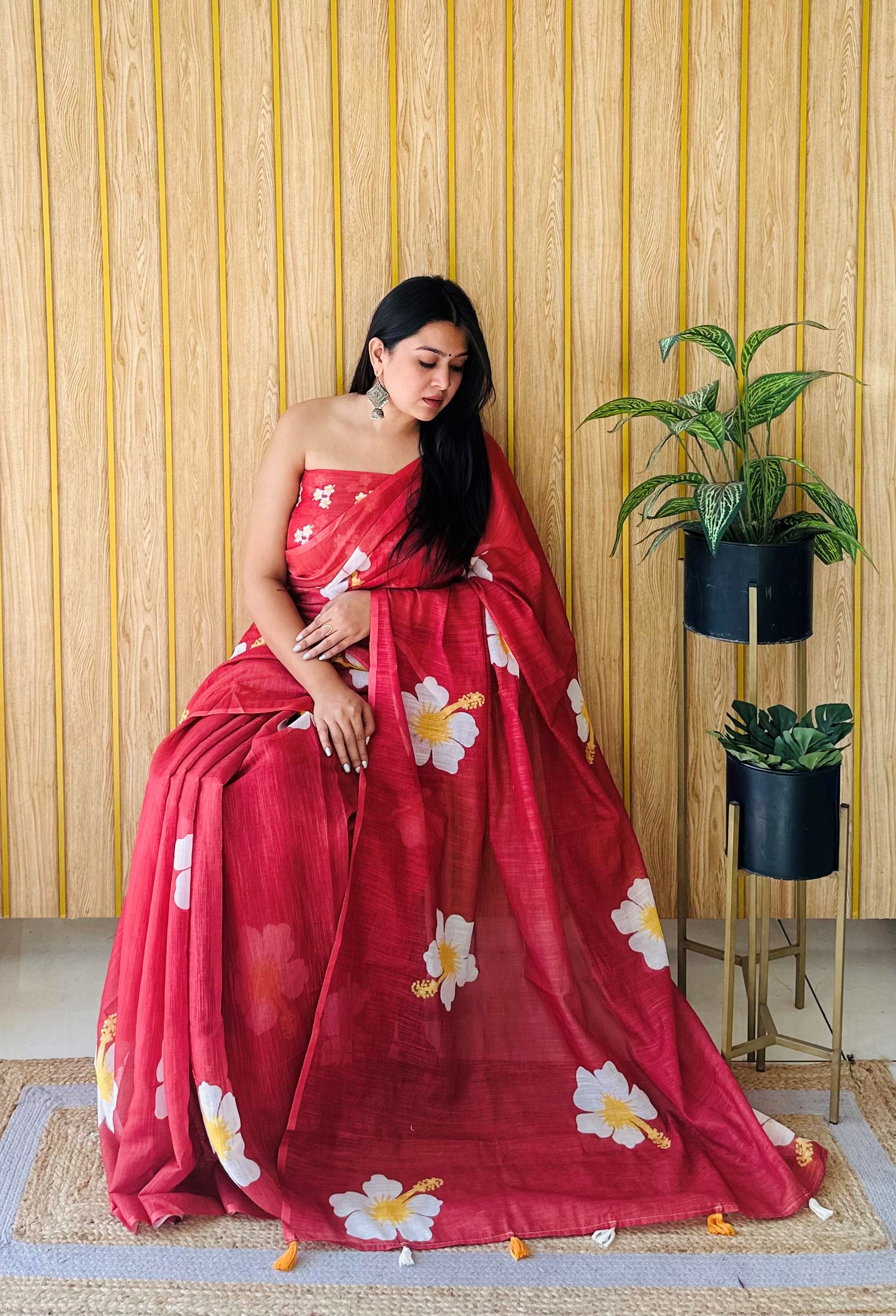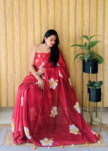 The rich maroon shade exudes elegance and warmth, while the floral printed motifs bring a youthful and girlie appeal to the overall look. The natural texture of linen enhances its charm, giving it a refined yet effortless vibe. Lightweight and easy to carry, this saree is perfect for brunches, festive celebrations, office gatherings, or even casual outings where you want to look stylish yet stay comfortable.