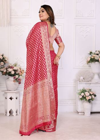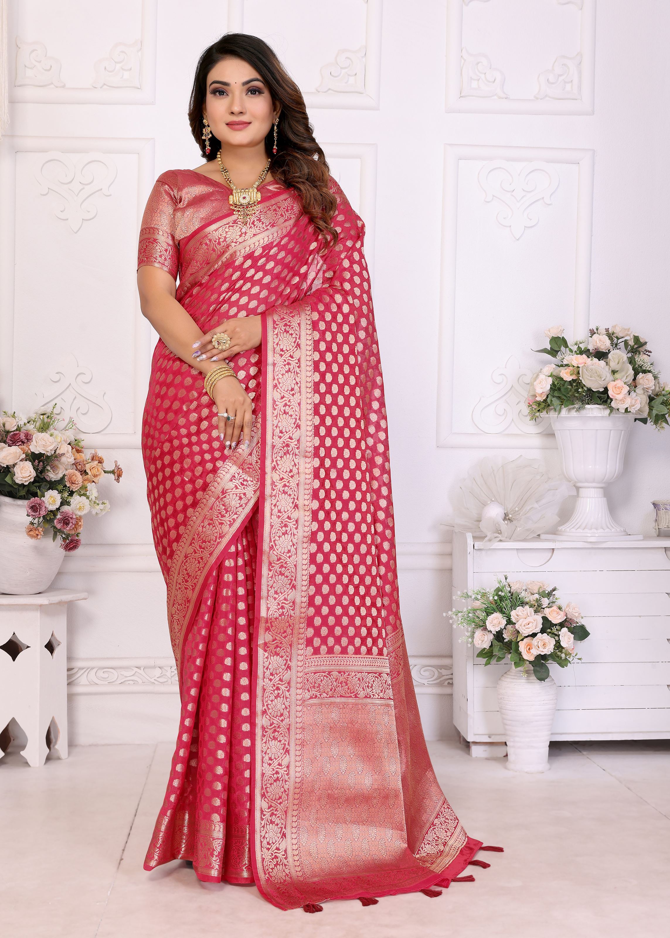 Complementing the saree is a matching maroon organza blouse fabric, allowing you to design a blouse that perfectly suits your style. Whether you prefer a traditional full-sleeved blouse or a contemporary cut, this versatile fabric ensures endless styling possibilities. Pair it with antique gold jewelry for a majestic ethnic look, or with delicate accessories for a more subtle, elegant appearance.Graceful, rich, and captivating, the Maroon Organza Gold Zari Saree is a must-have for women who wish to exude timeless beauty at every celebration.