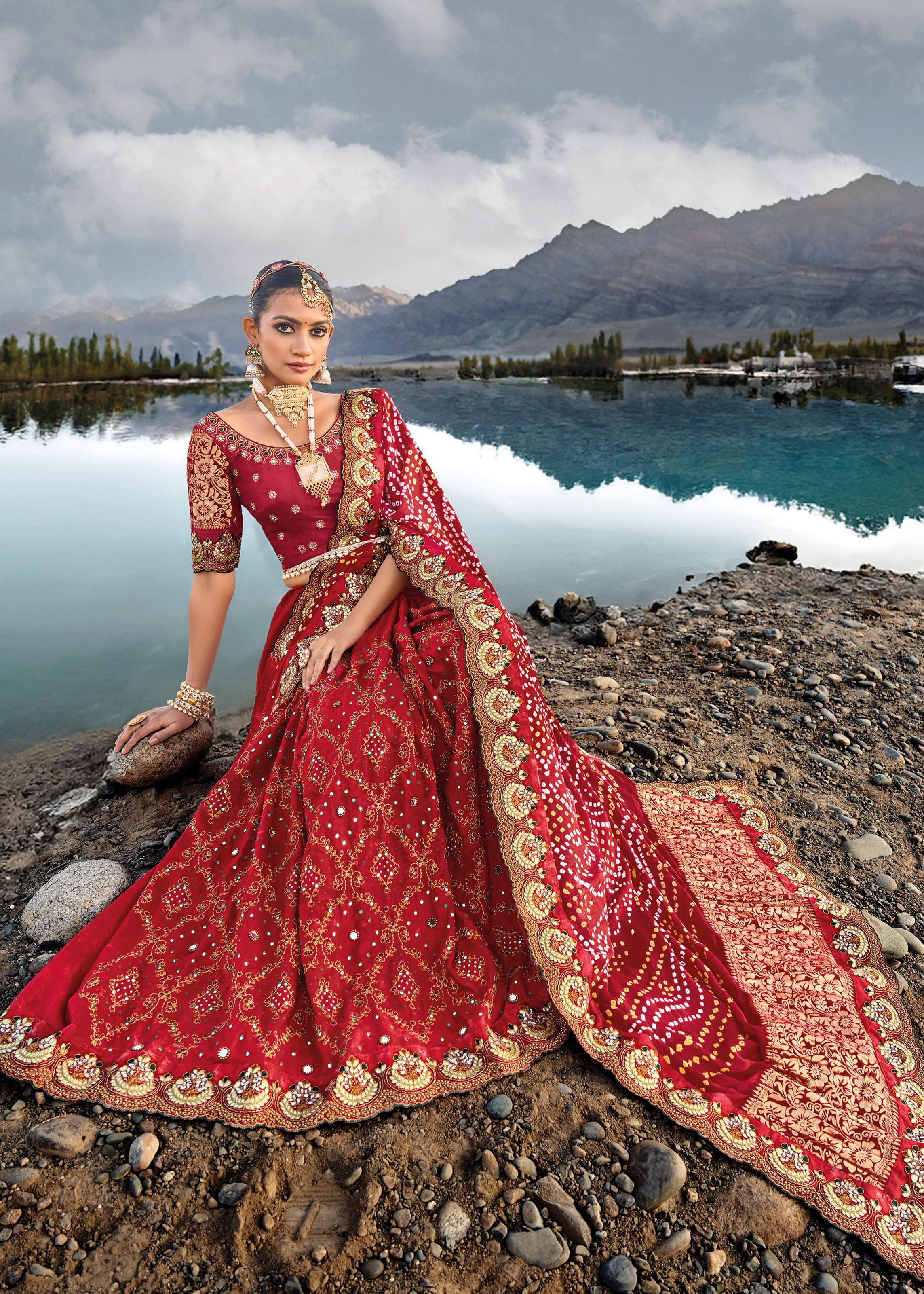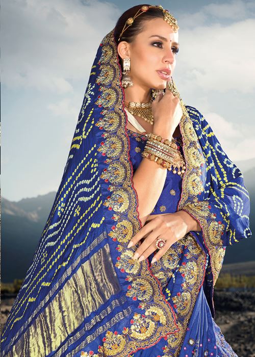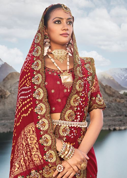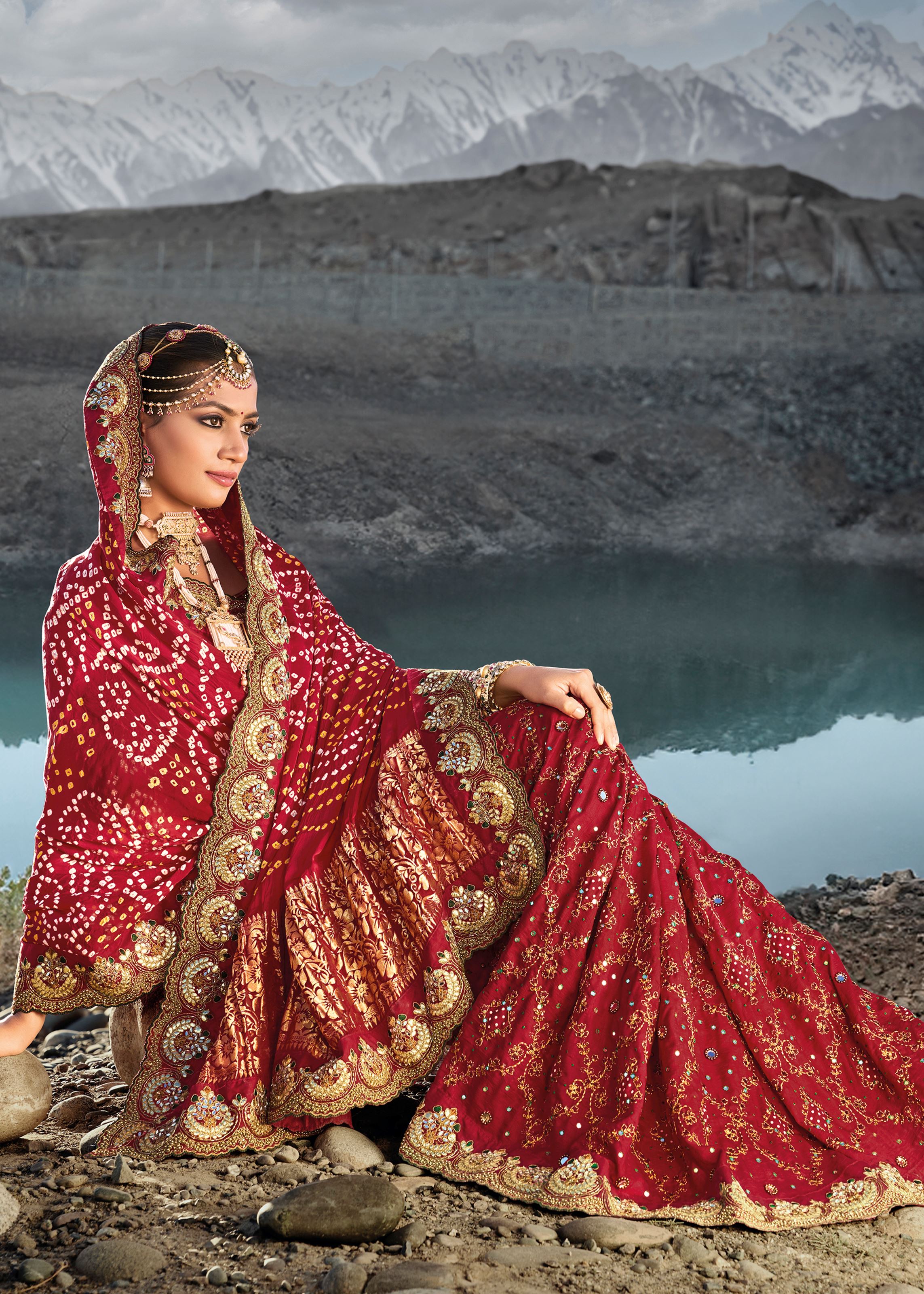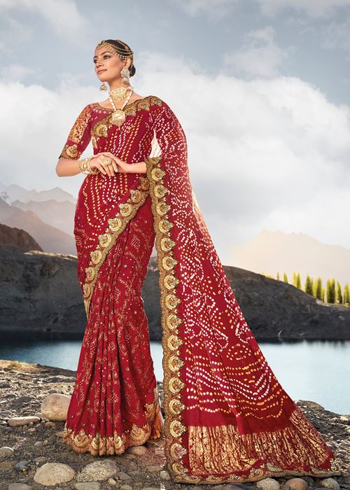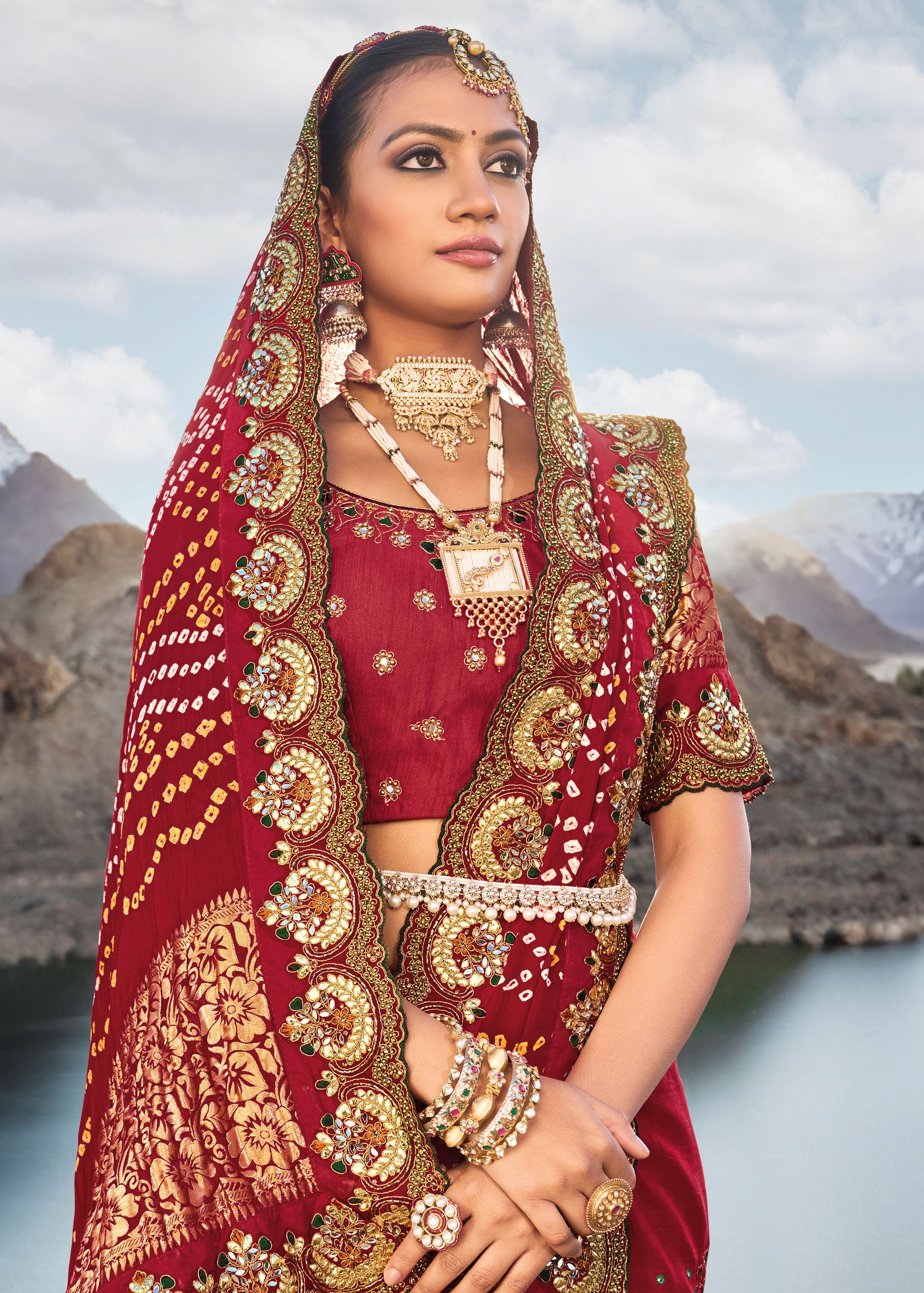 Maroon Pure Gajji Bandhej Satin Saree With Embroidred With Mirror, Moti and Cut Dana Work